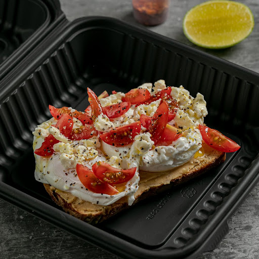 Pan de hogaza de masa madre, aguacate, dos huevos pocheados, cama de hummus, tomate cherry, queso de cabra y aceite de oliva.