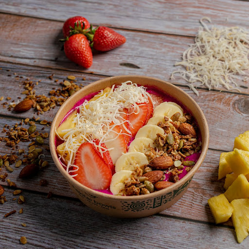 Poke con base de pitaya orgánica, piña, fresa, plátano, coco orgánico, granola y miel de abeja orgánica.
