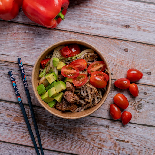 Poke con arroz de coliflor, filete de res choice, aguacate, pimiento morrón rojo asado, cebolla cambray asada, tomate cherry.