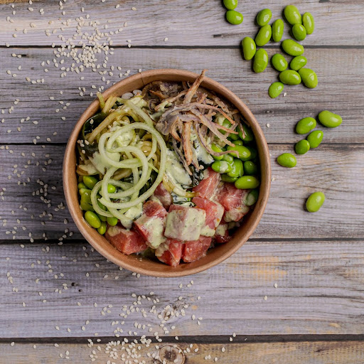 Poke con arroz gohan, atún (crudo), noodles de pepino, edamames, cebolla frita, ensalada de alga, soya preparada y mayo aguacate/poblano.