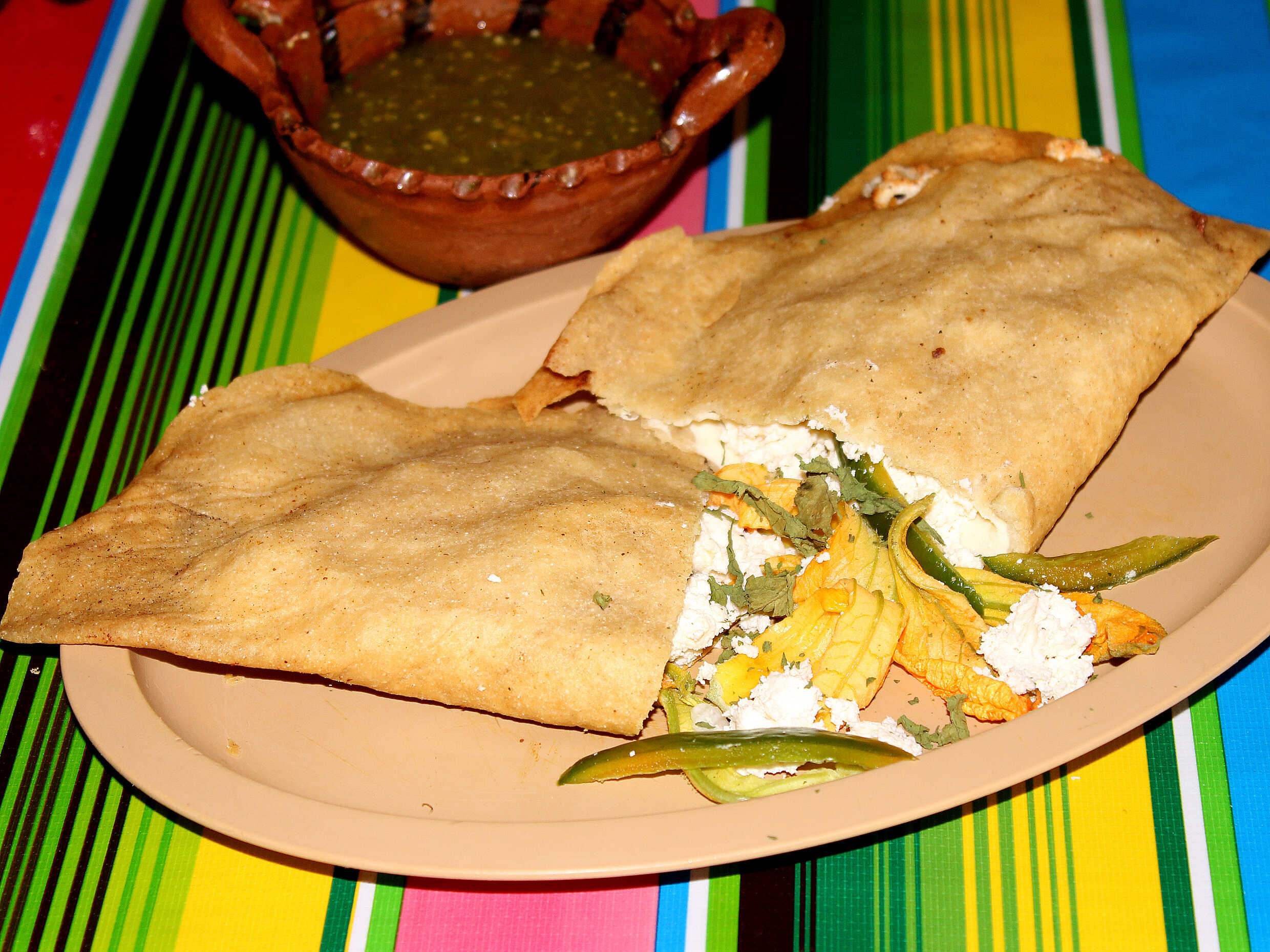 Molote grande (aprox 30cm) Relleno deChicharrón, flor de calabaza, epazote y rajas. Acompañados de salsa y crema