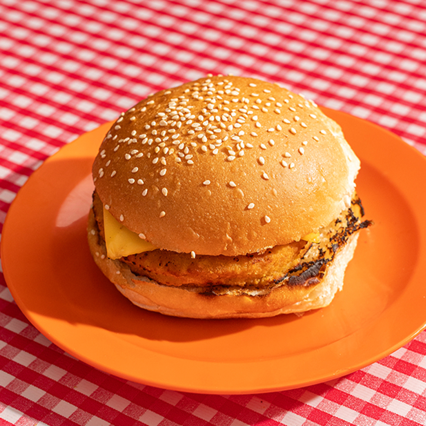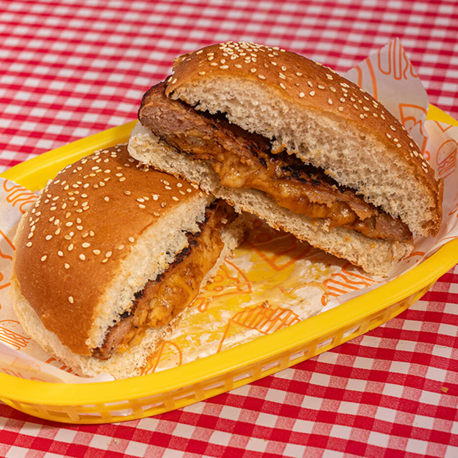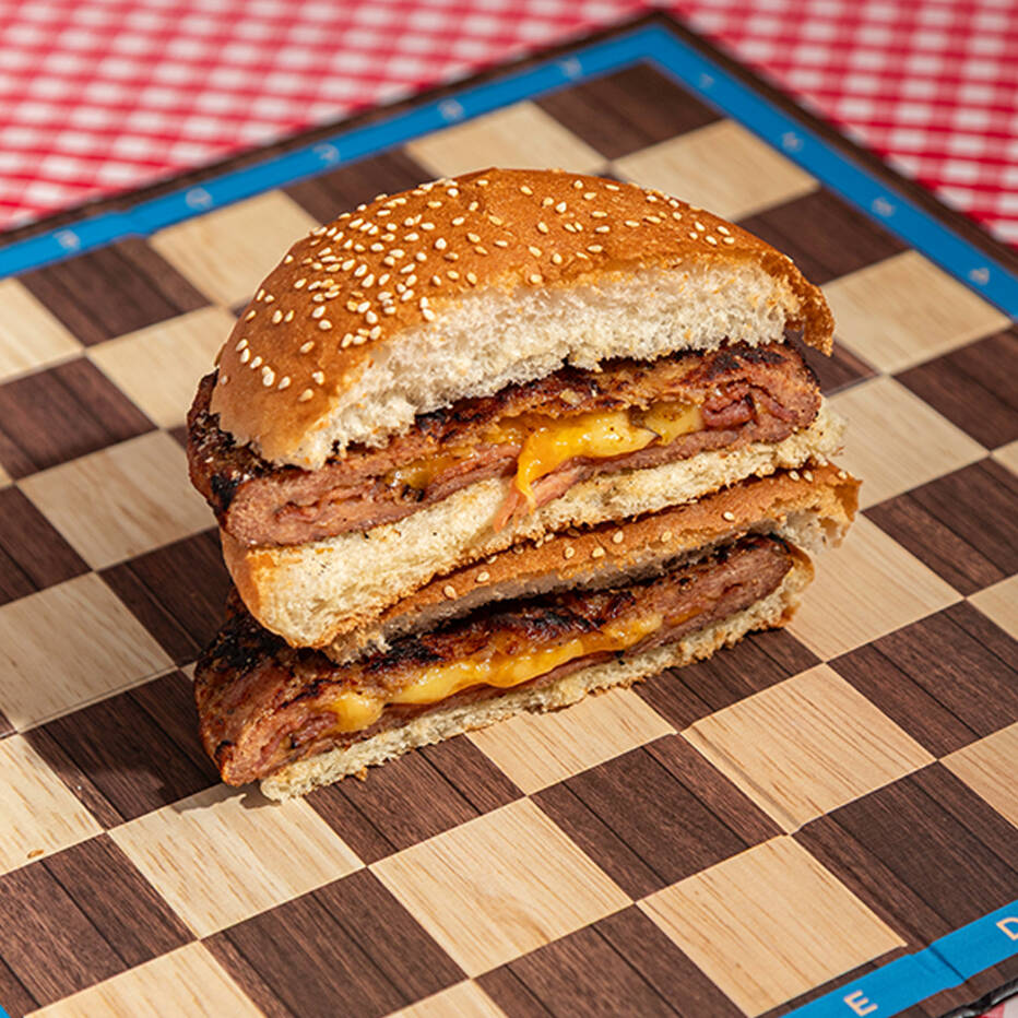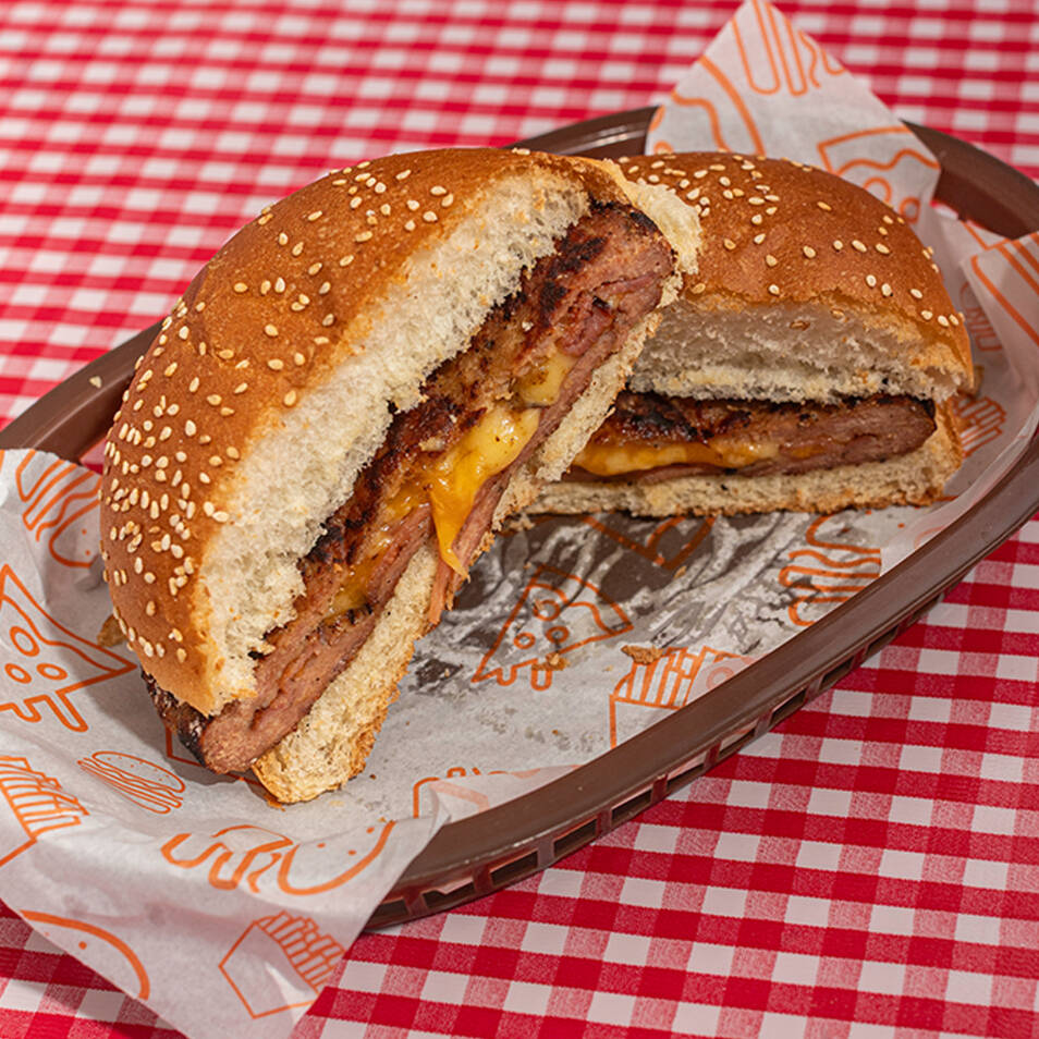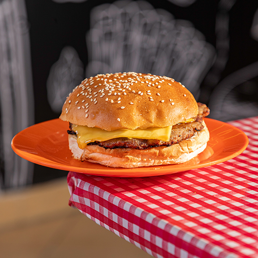 Hamburguesa Rellena de queso manchego-cheddar, jamón y piña. (300 gr).