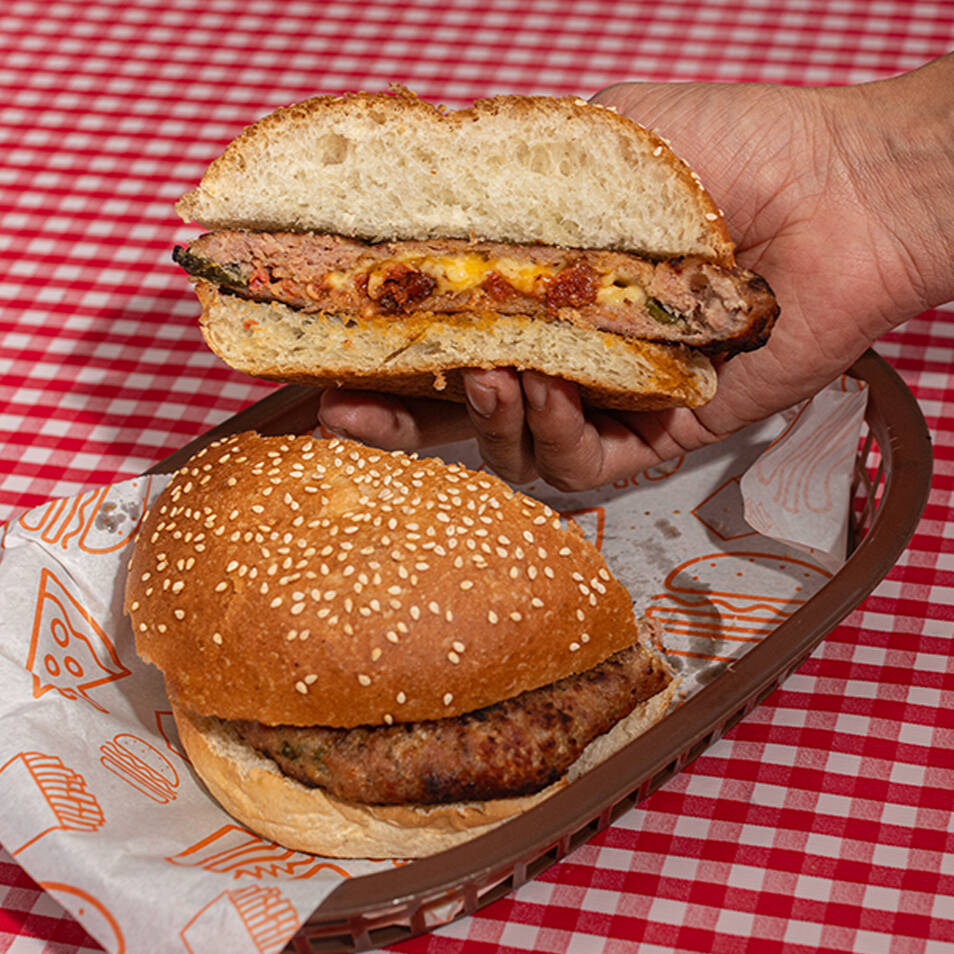 Hamburguesa rellena de queso manchego-cheddar, chorizo y rajas poblanas sazonadas. (300 gr)