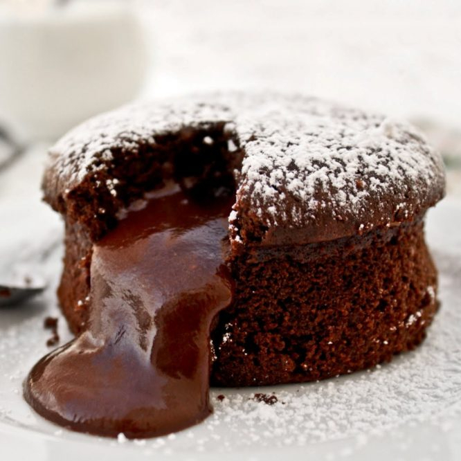 Bizcocho relleno de chocolate (100gr.) acompañado con una bola de helado.