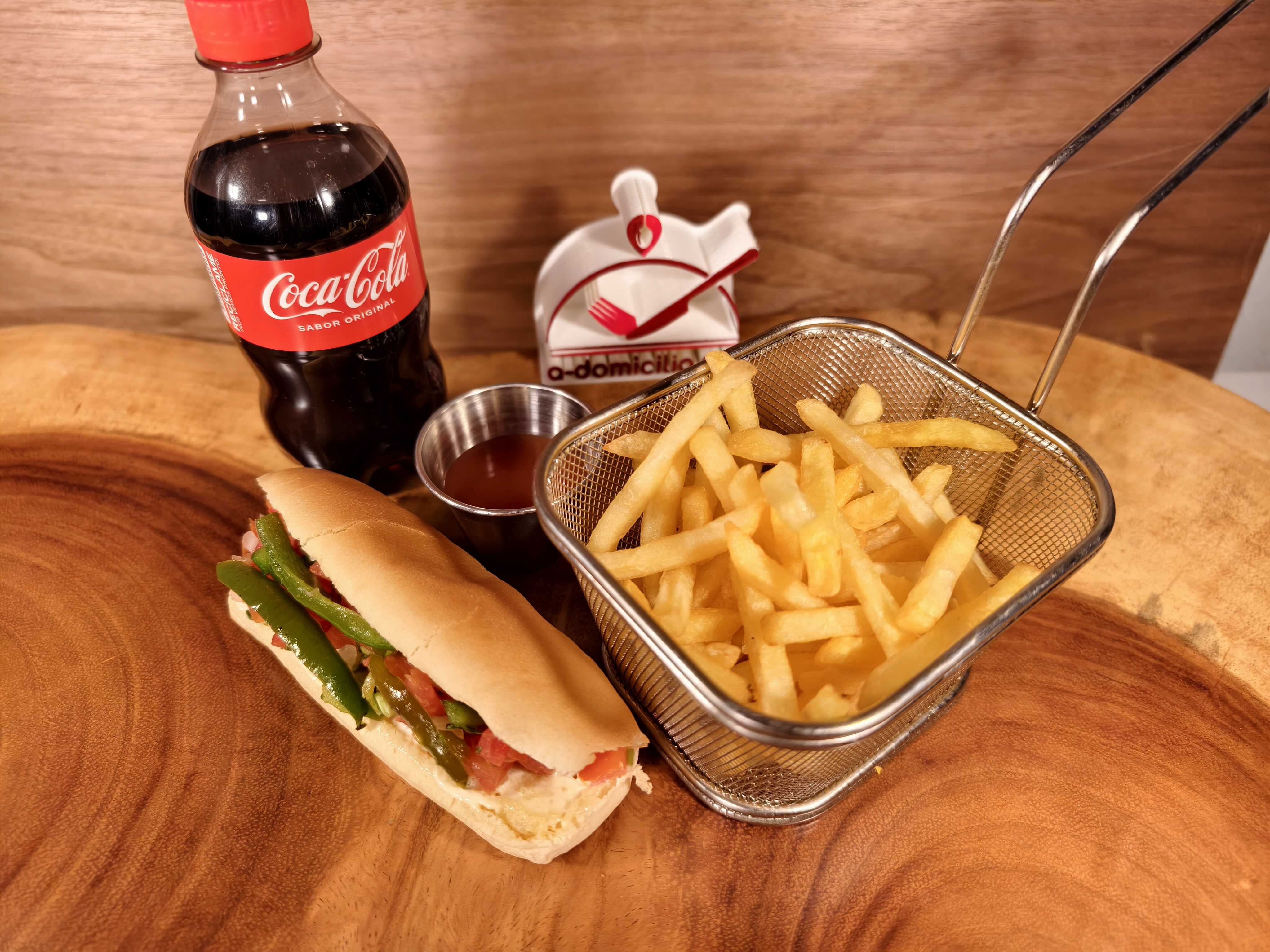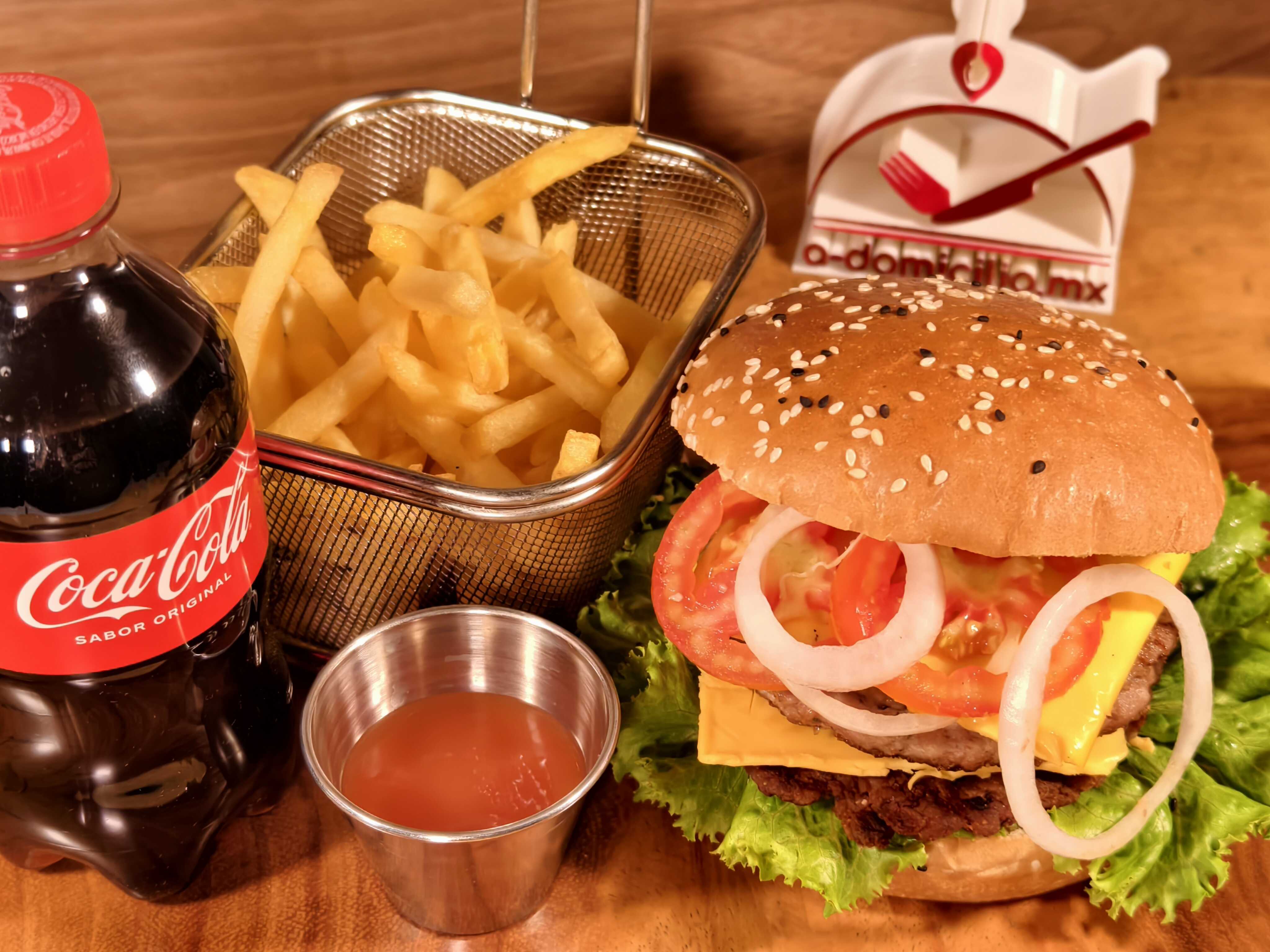 Hamburguesa con una carne de 90-110g, Queso Americano, Vegetales y Salsas + Papas a la francesa + Bebida