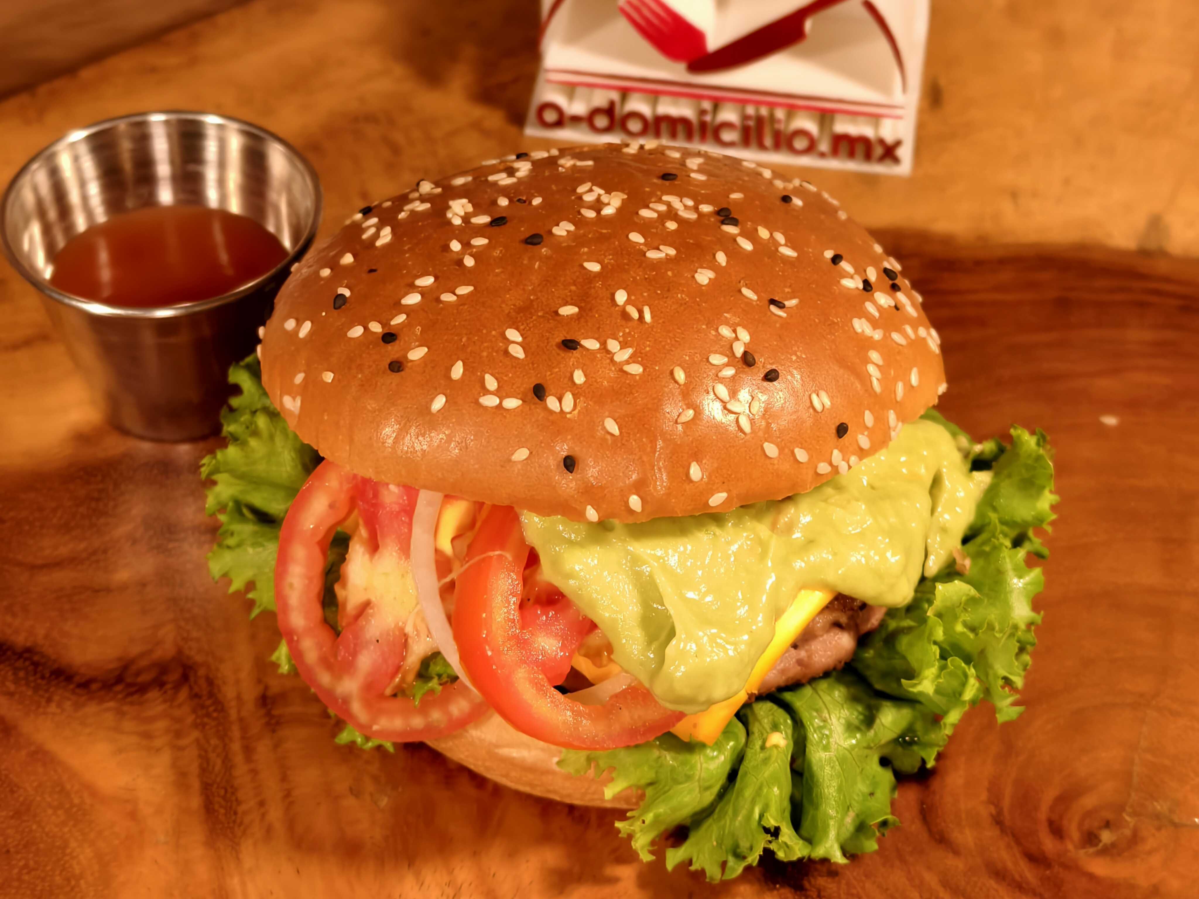 Hamburguesa con una carne de 90-110g, Queso Americano, Vegetales y Guacamole