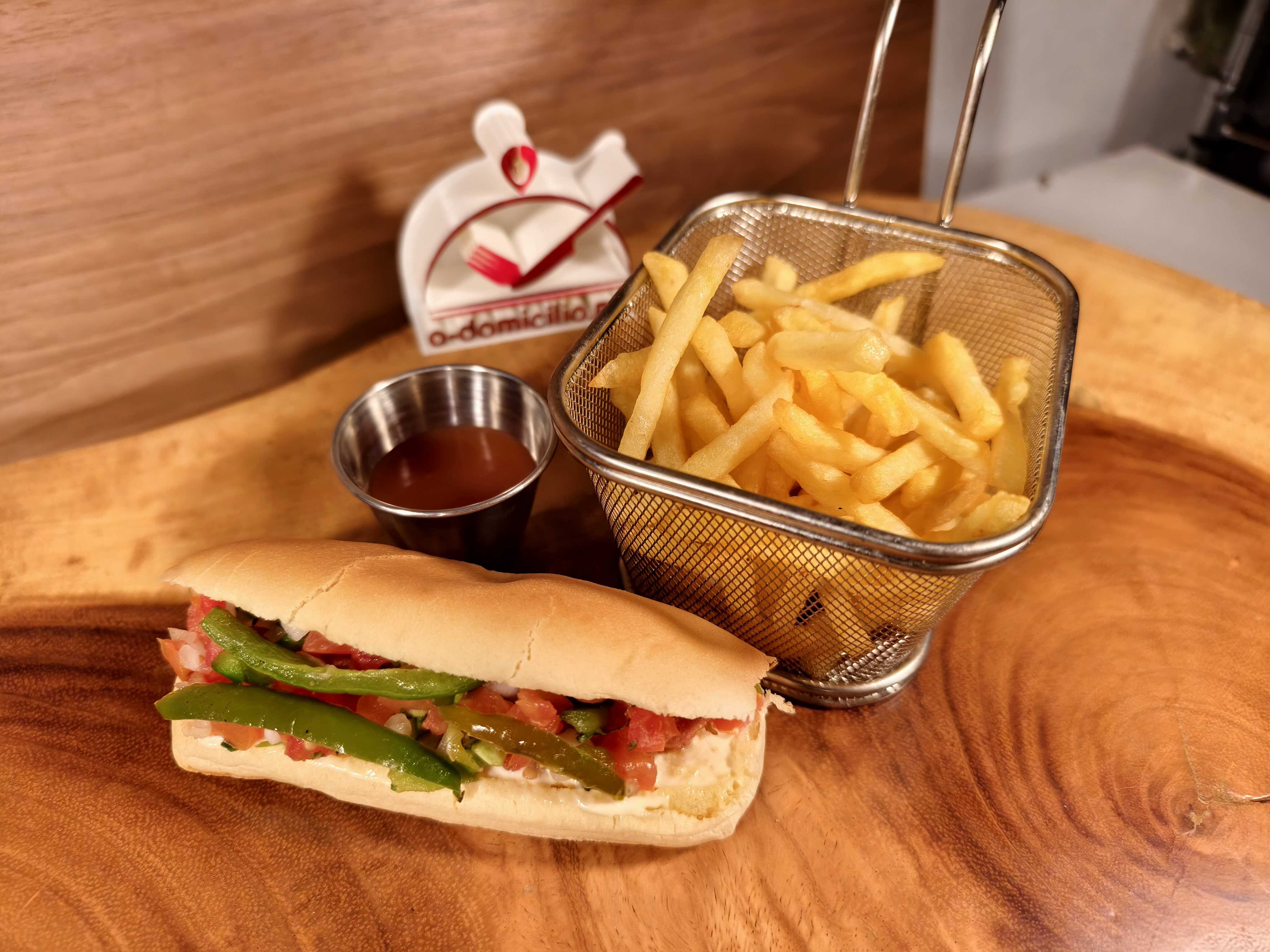 Hot Dog con salchicha de Pavo acompañado de mayonesa,mostaza,catsup,lechuga,jalapeño y jitomate + Papas a la Francesa
