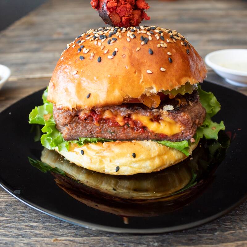 120 g de carne de res especiada, rellena de quesos gouda, mozzarella y americano, con un baño de BBQ casero, en pan artesanal con vegetales frescos.