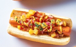 Salchicha, quesillo, piña, jamón, tocino, mostaza, catsup, picante.