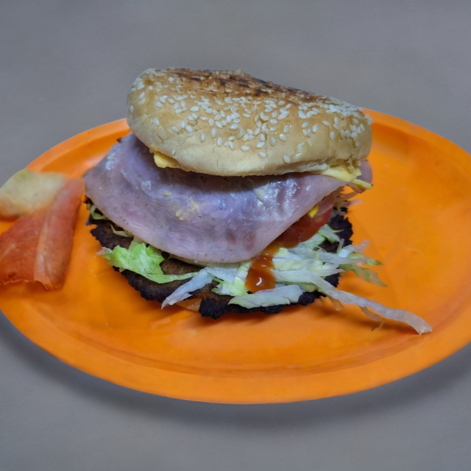 Carne, jamón, queso amarillo, tomate, cebolla, catsup, mostaza, picante y lechuga.
