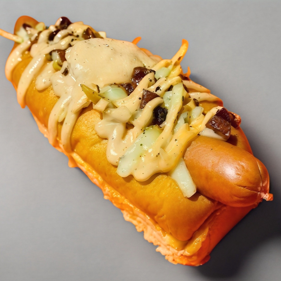 Salchicha, quesillo, tocino, picante, mostaza, catsup.