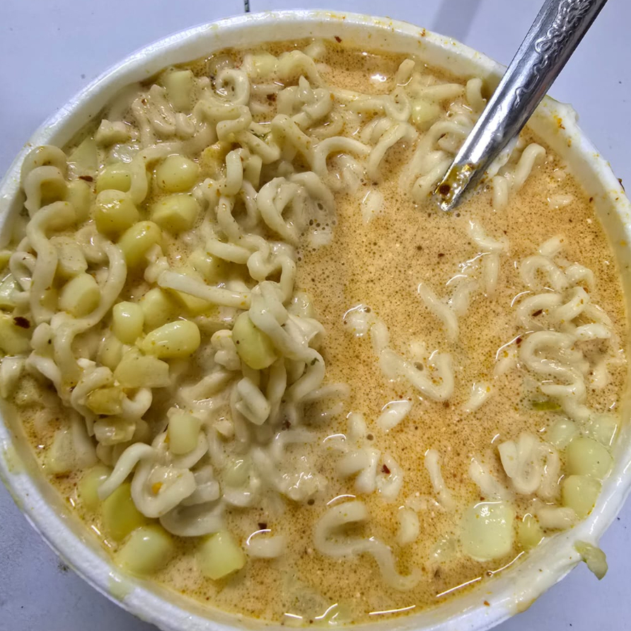 Maruchan, esquites, limón, queso, picante y mayonesa.
