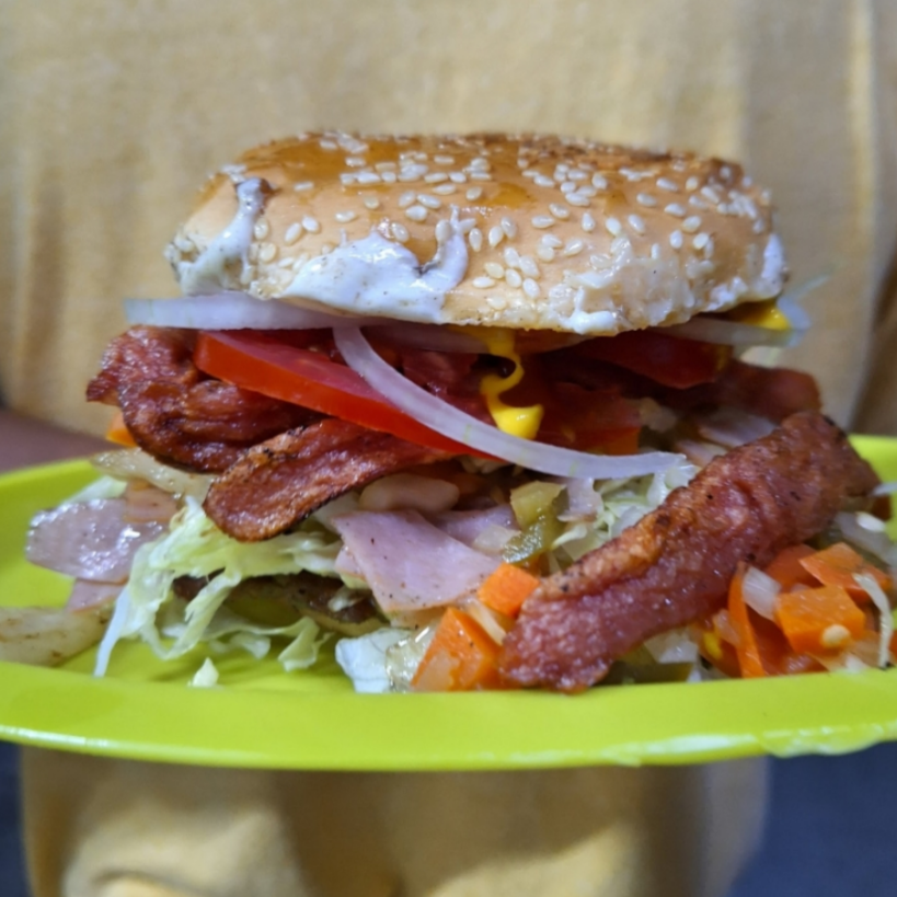 Doble carne, queso, quesillo, jamón, salchicha, jitomate, cebolla, mostaza, catsup, picante y lechuga.