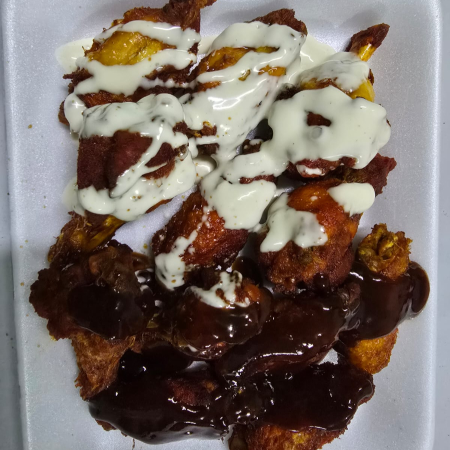 6 alitas, aderezo a elegir: Ranch, BBQ, maggi, valentina, salsa macha, tamarindo habanero, mango habanero, catsup