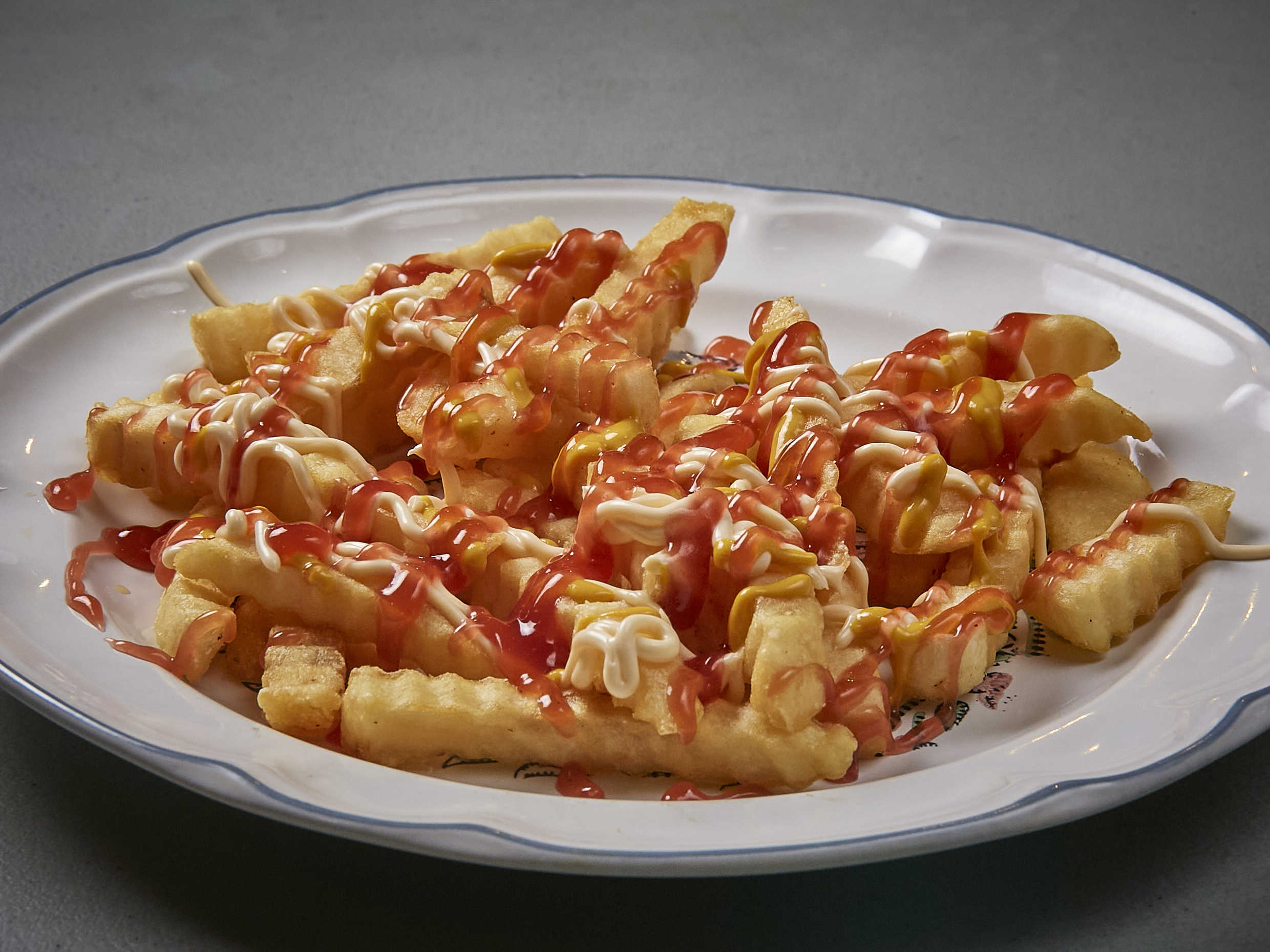 300 gr. de papas a la francesa con salsa y cátsup. (peso en frío)