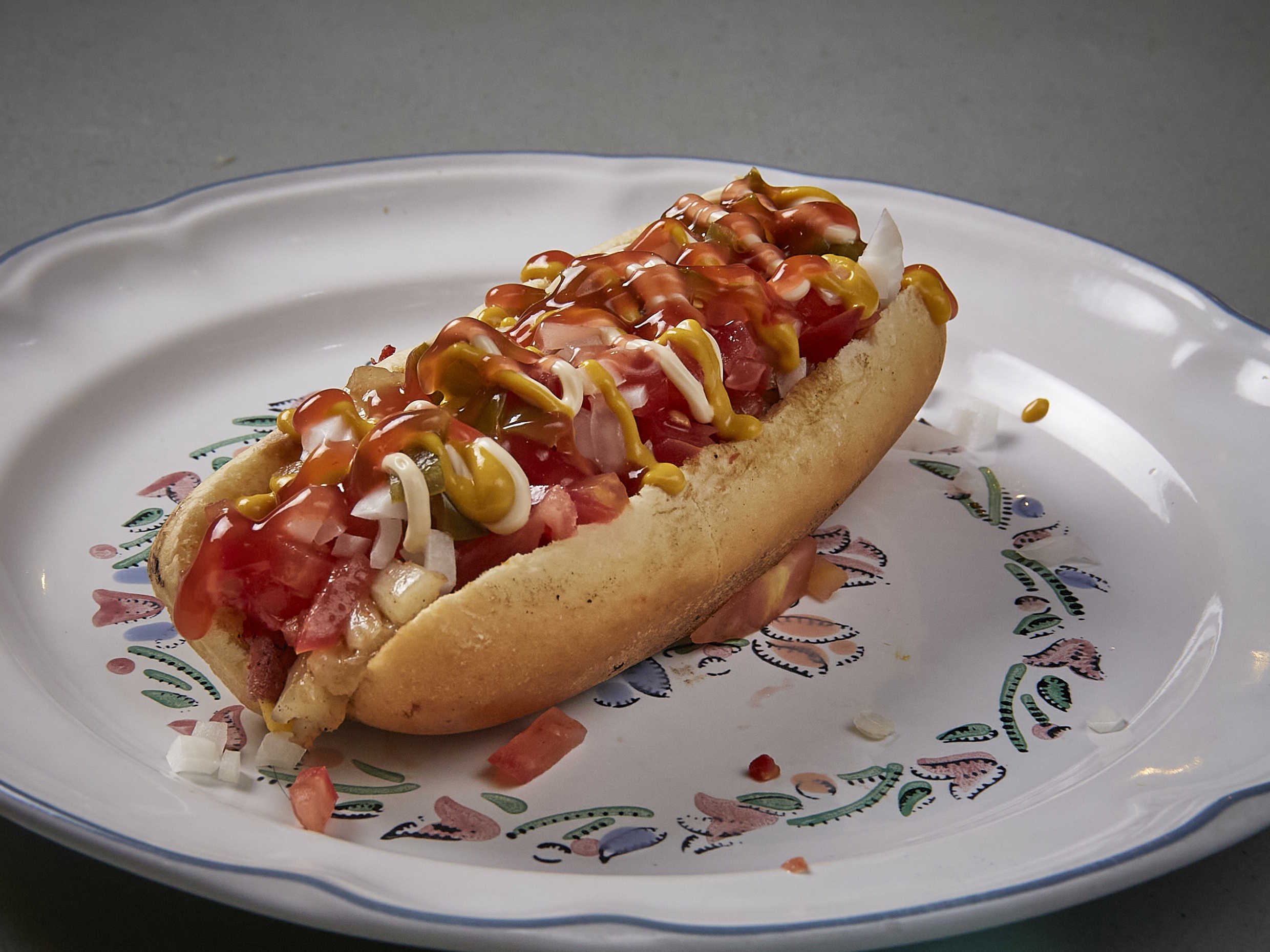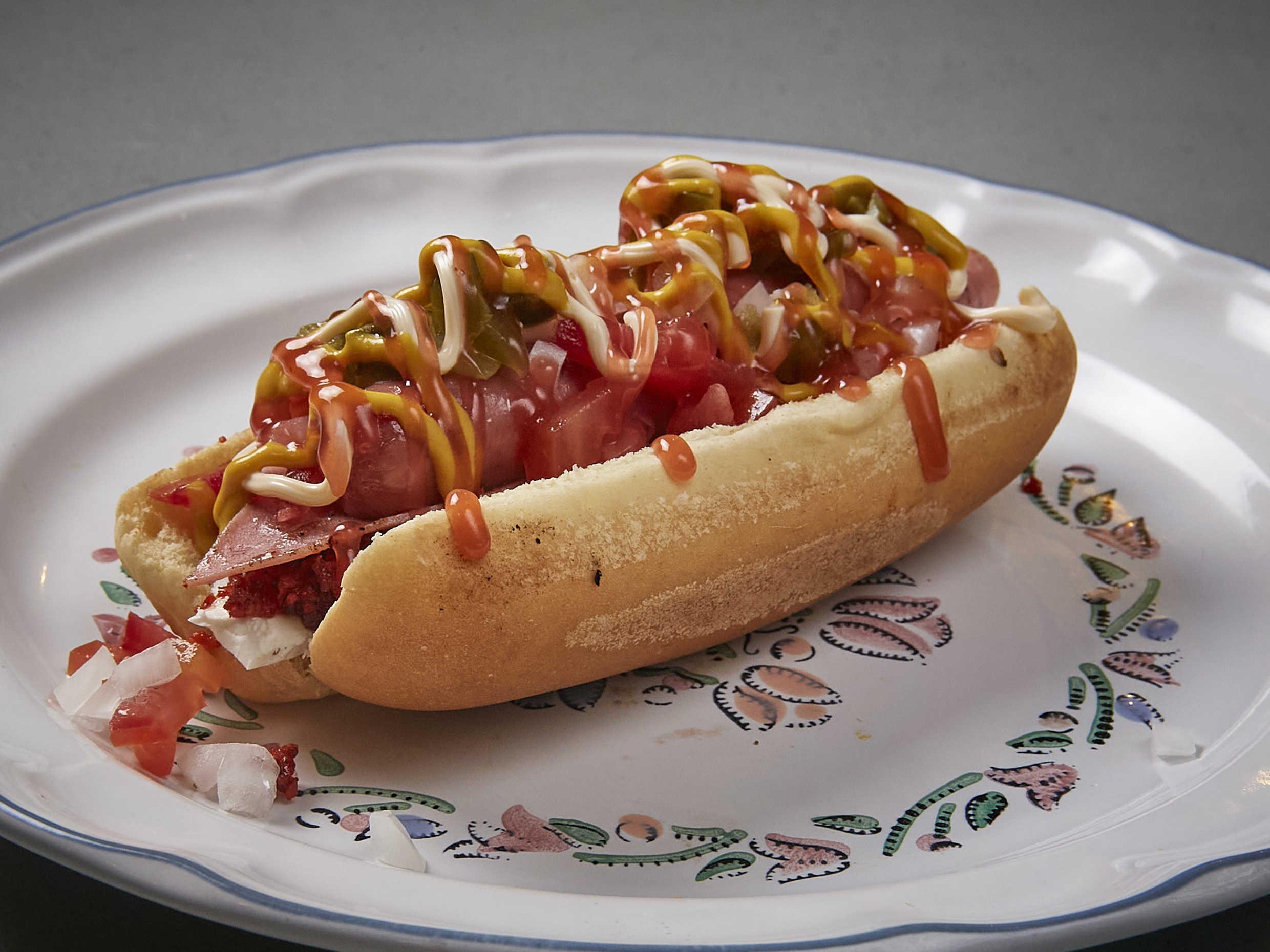 Salchicha tipo viena, longaniza, jamón, queso, vegetales y aderezos.