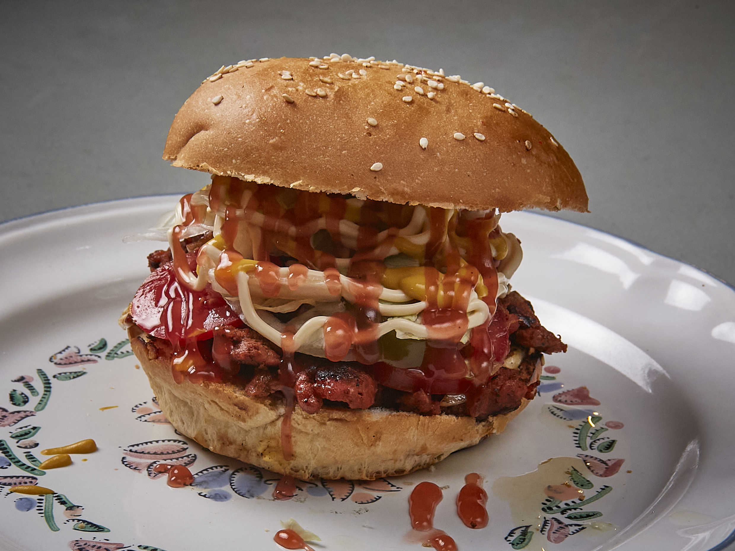 2 hamburguesas de pan artesanal con 120gr. de deliciosa carne al pastor, quesos, jamón, verduras y aderezos a precio especial.