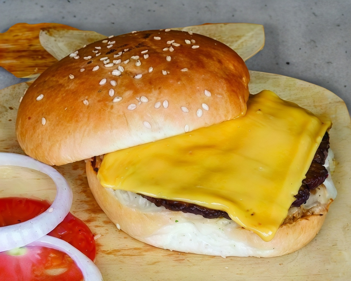Pan artesanal con carne 100% de res con delicioso queso cheddar, tocino, queso, vegetales y aderezos.