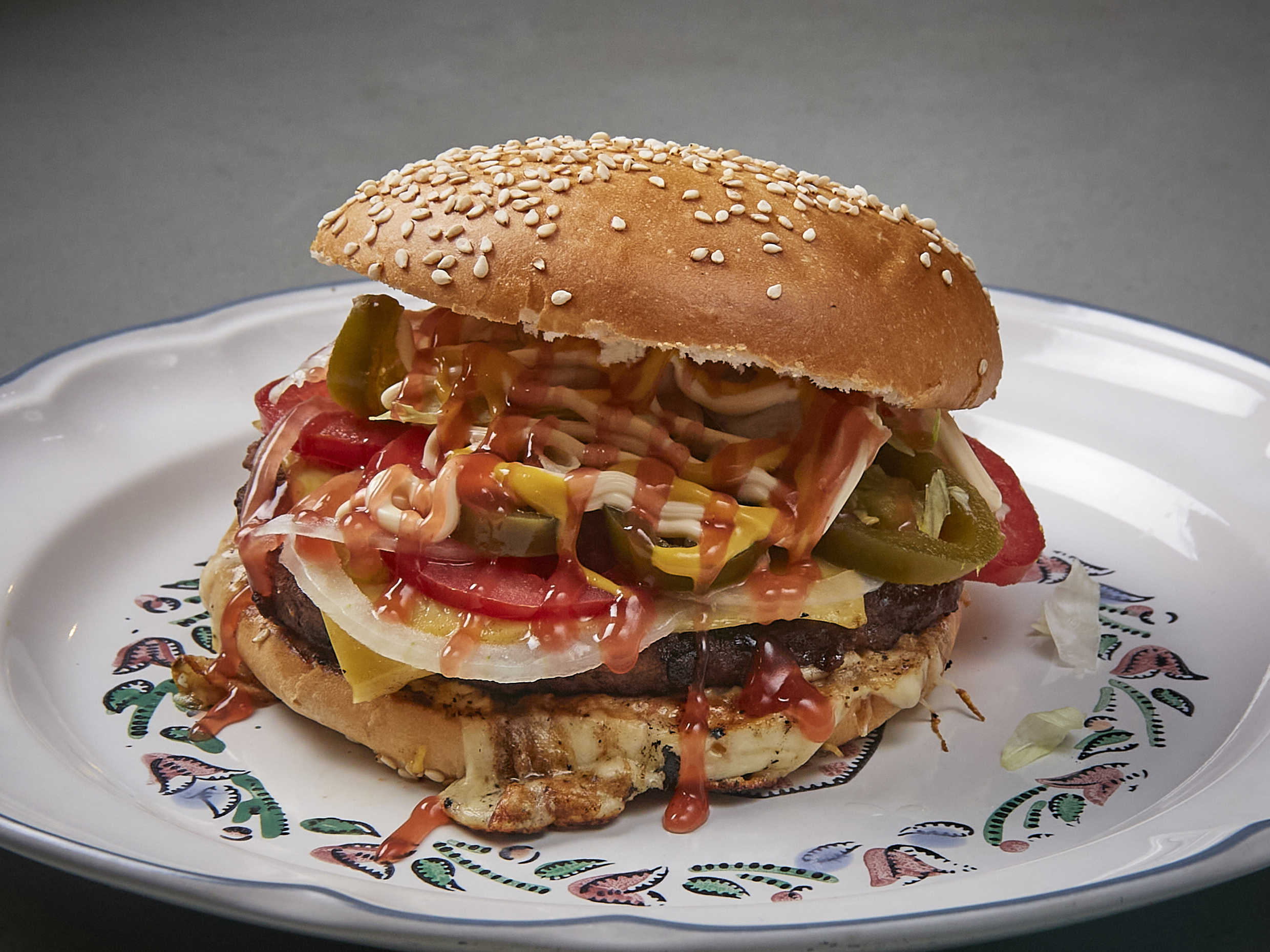 Pan artesanal con carne 100% de res, jamón, queso, vegetales y aderezos.