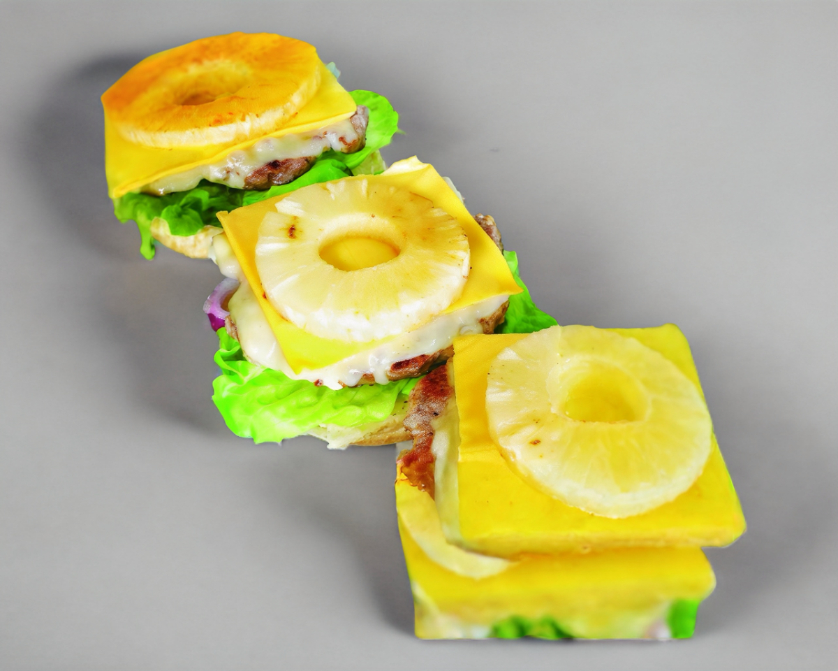 Pan artesanal con Doble carne 100% de res, doble queso, doble jamón, piña, vegetales y aderezos.