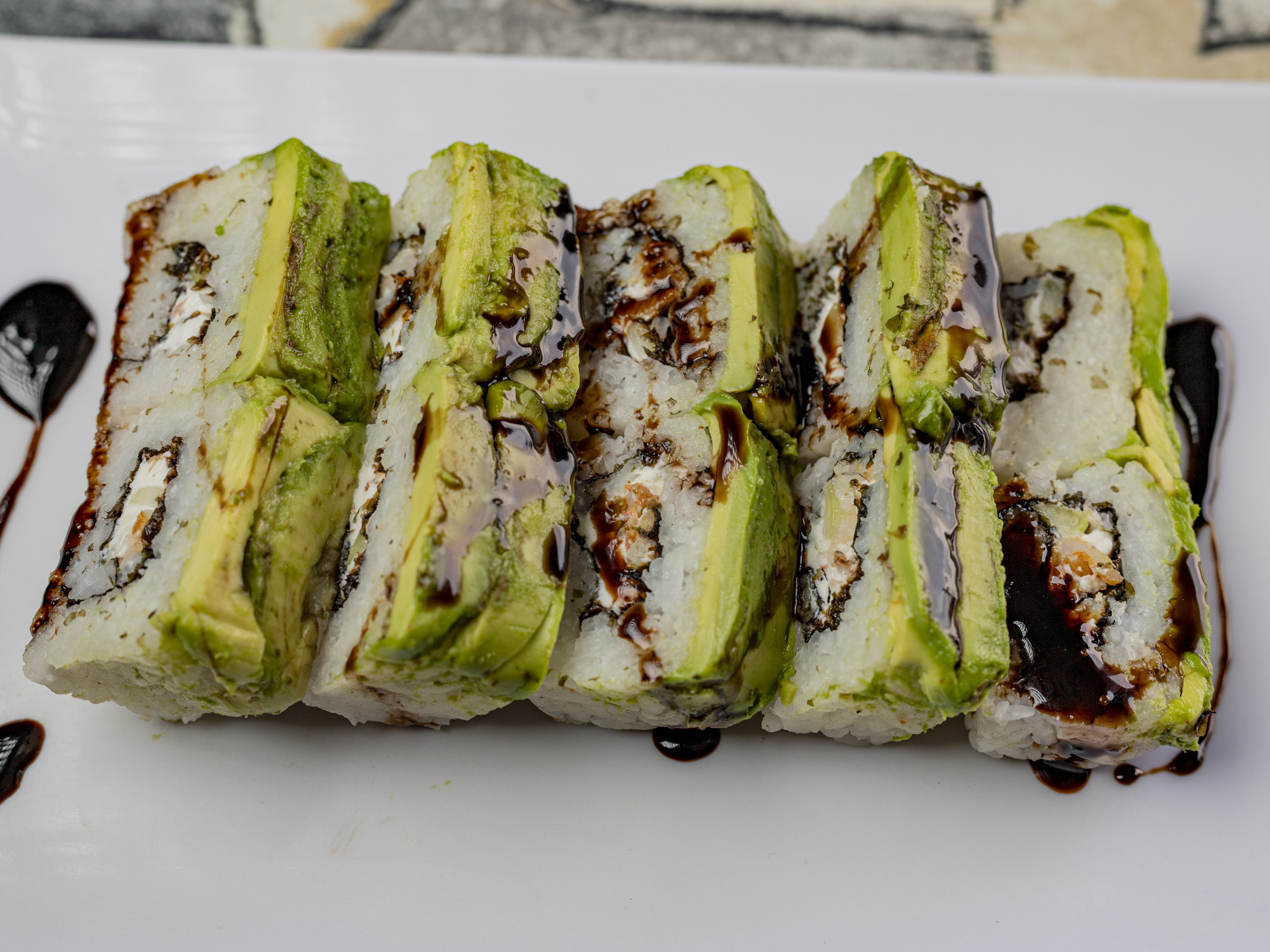 PD: Pepino, aguacate, philadelphia, camarón y piña. PF: Alga y salsa de anguila.