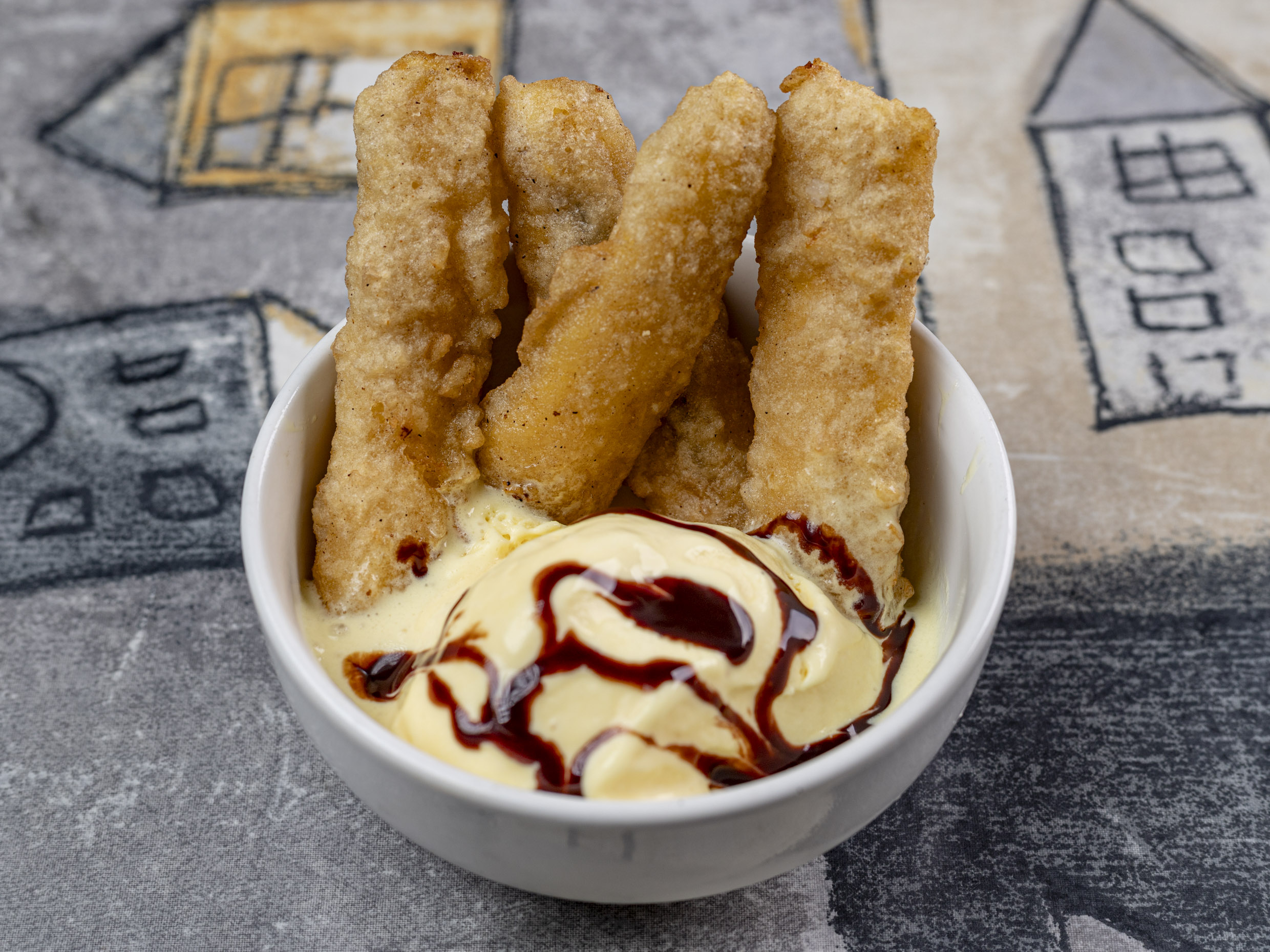 Plátano capeado, acompañado de helado bañado en la salsa de tu elección.