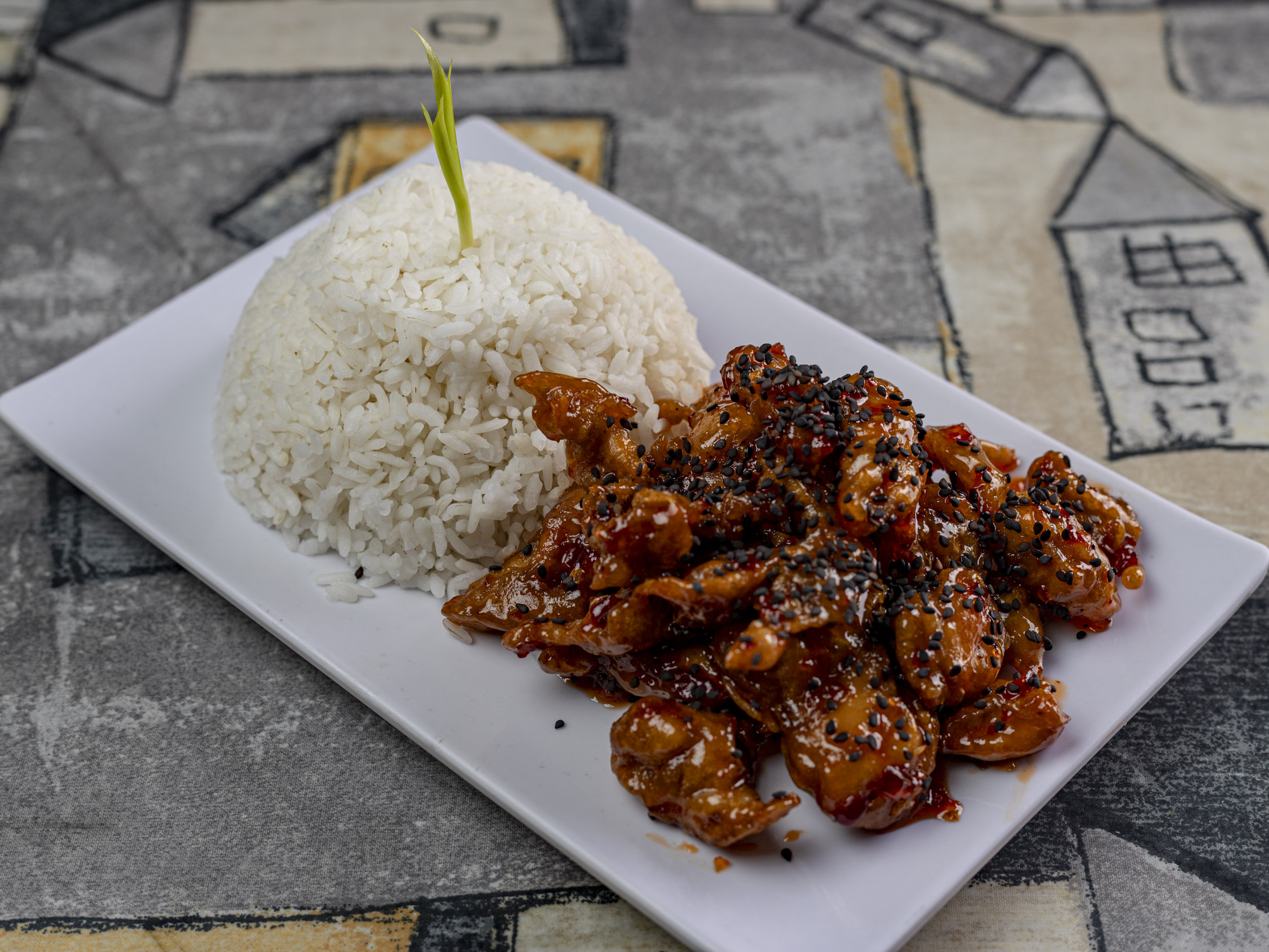 Pollo marinado y frito bañado en una salsa agridulce y picosa. Acompañado de arroz gohan.