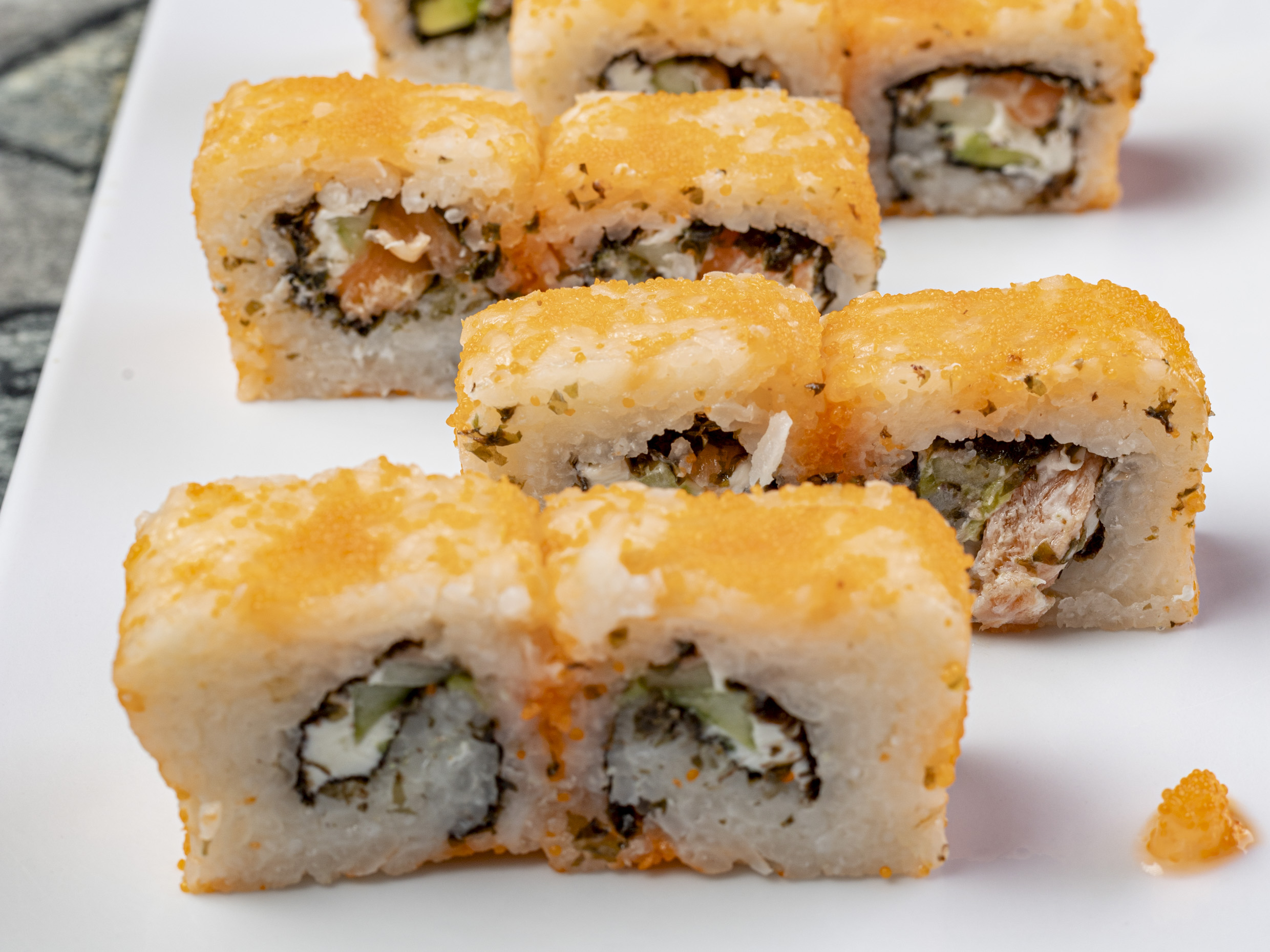 PD: Salmón, pepino, aguacate y philadelphia. PF: Masago.