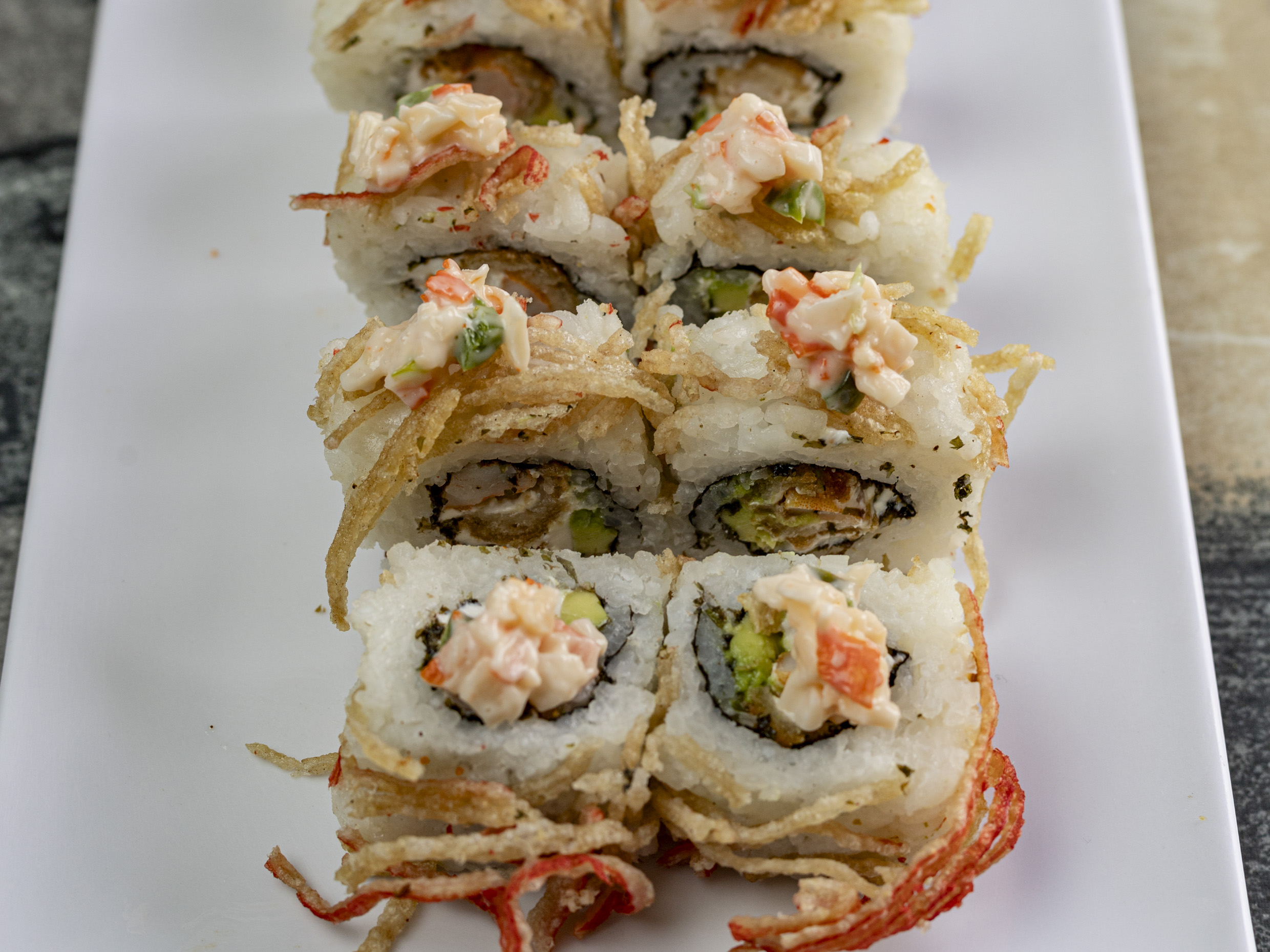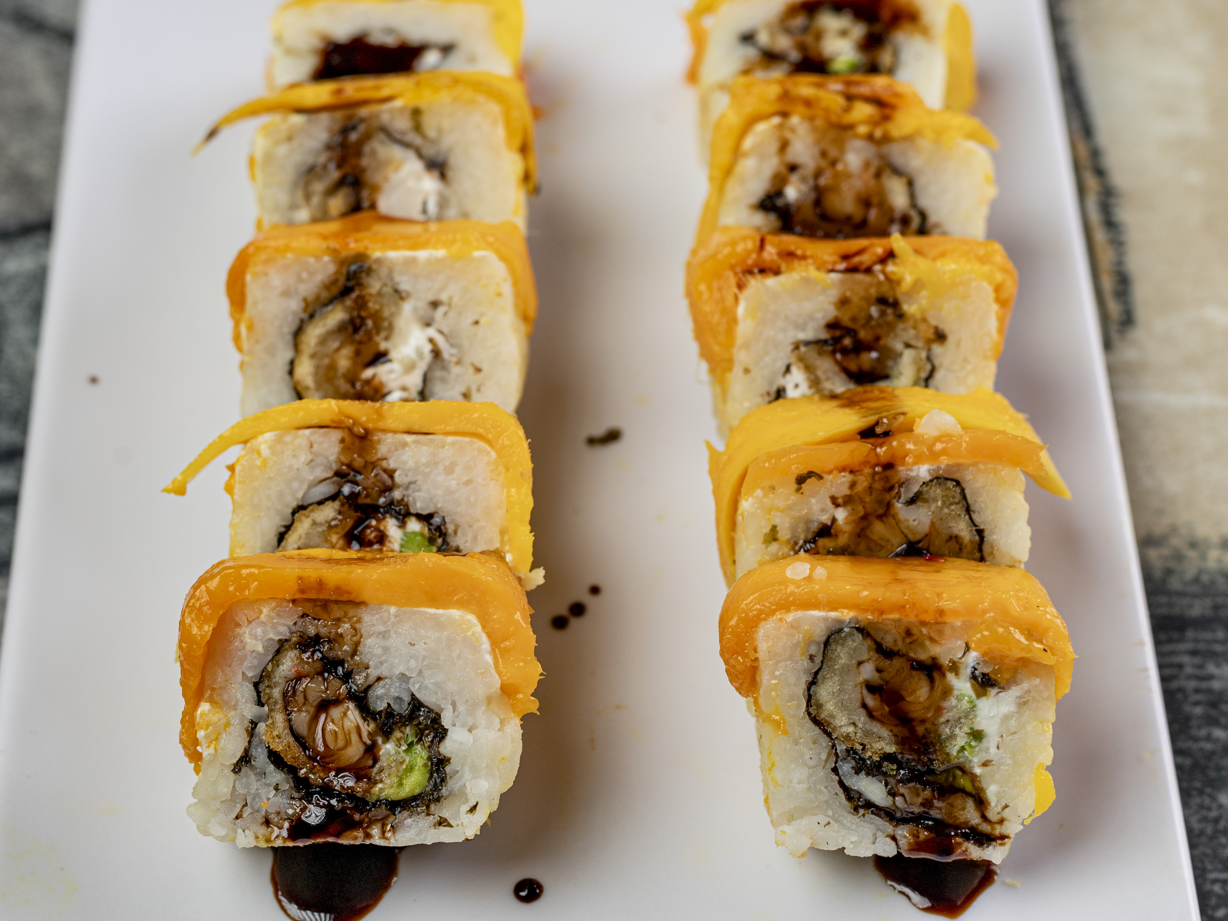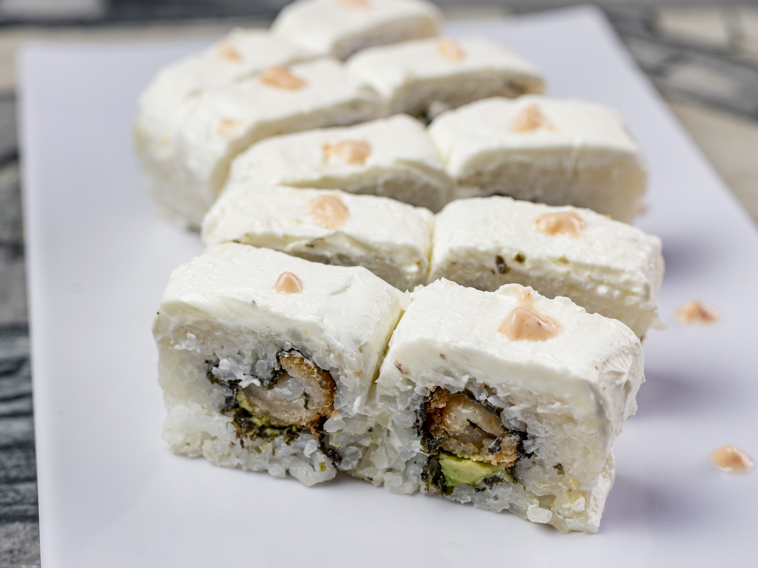 PD; Camarón empanizado, aguacate y philadelphia. PF: Empanizado en perlas de arroz y salsa de anguila.
