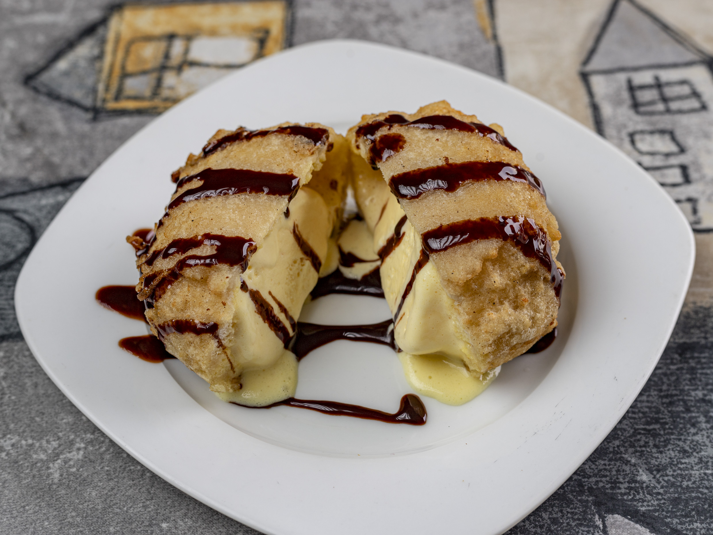 Helado frito, bañado en salsa a su elección.