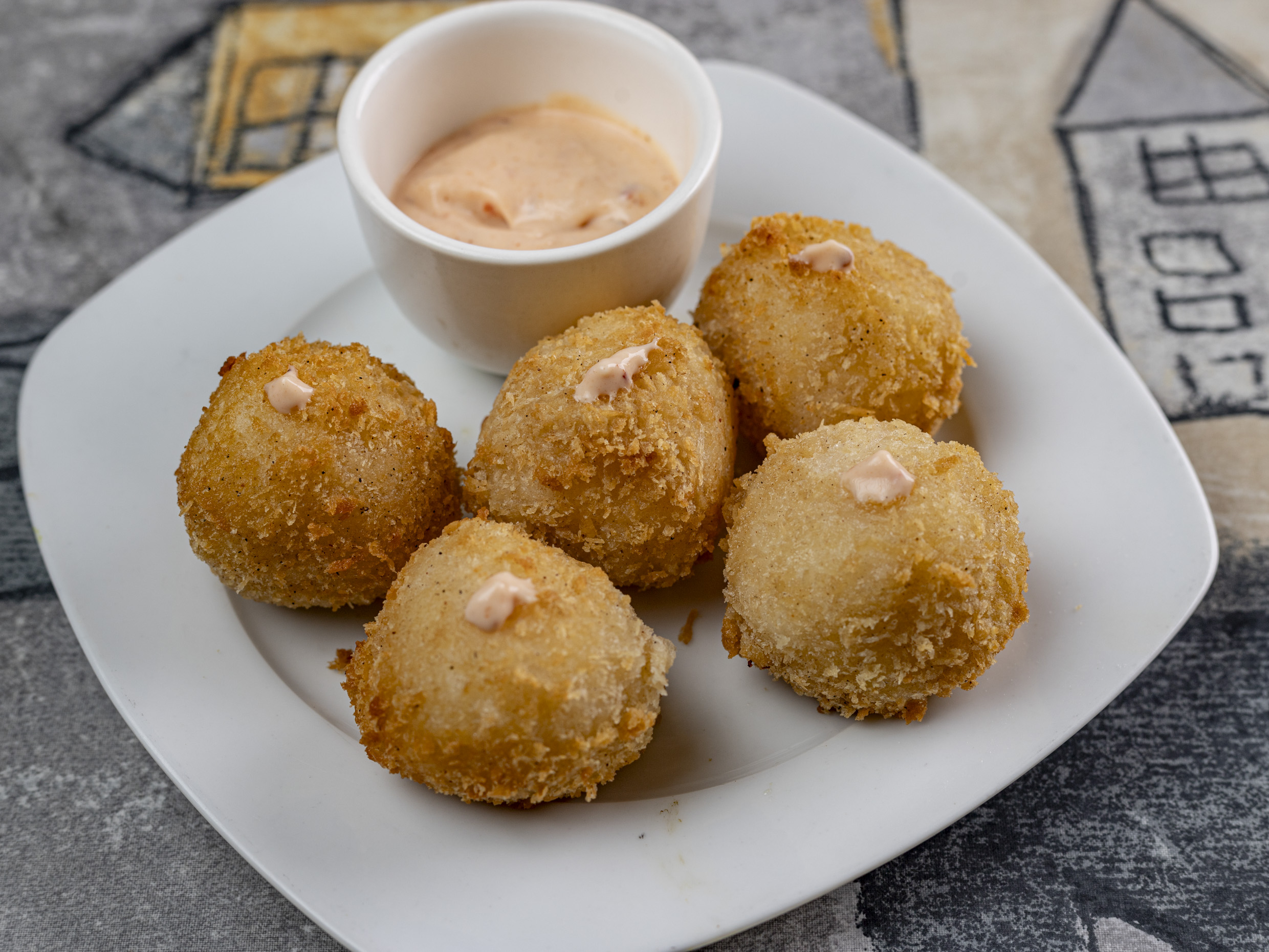 5 Piezas. queso gouda empanizado acompañado de aderezo de chipotle.