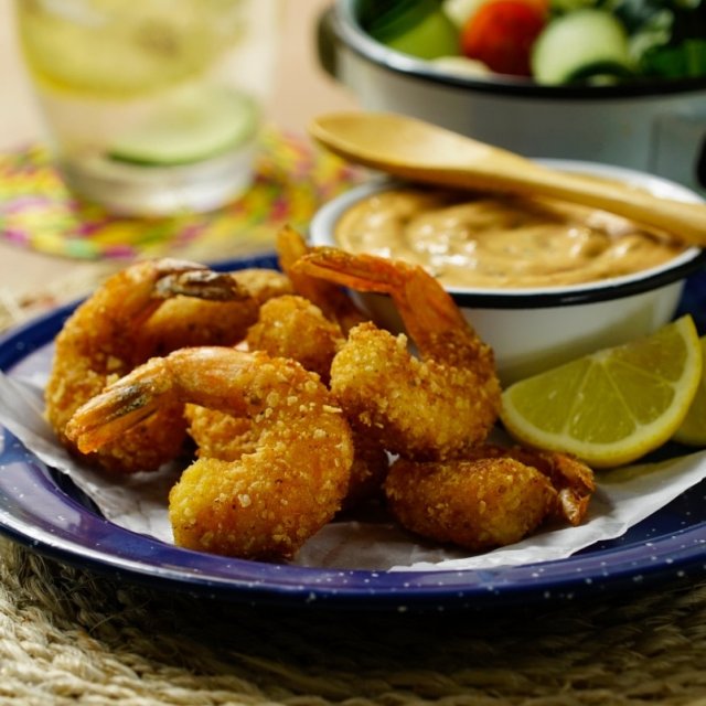 Camarones empanizados acompañados de aderezo chipotle.