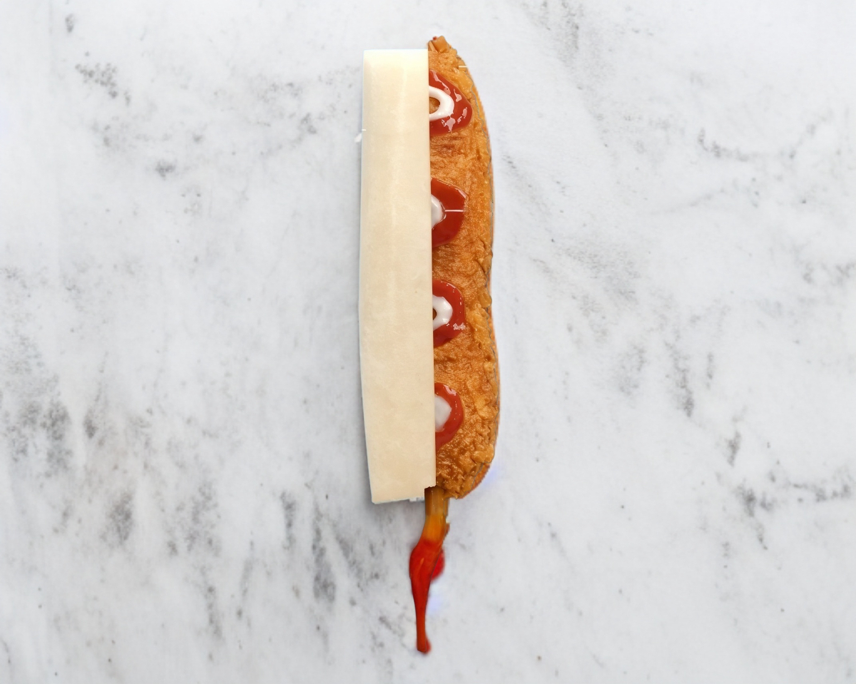 Crujiente banderilla de queso cheddar blanco, preparada con masa Hangang y cubierta crujiente.