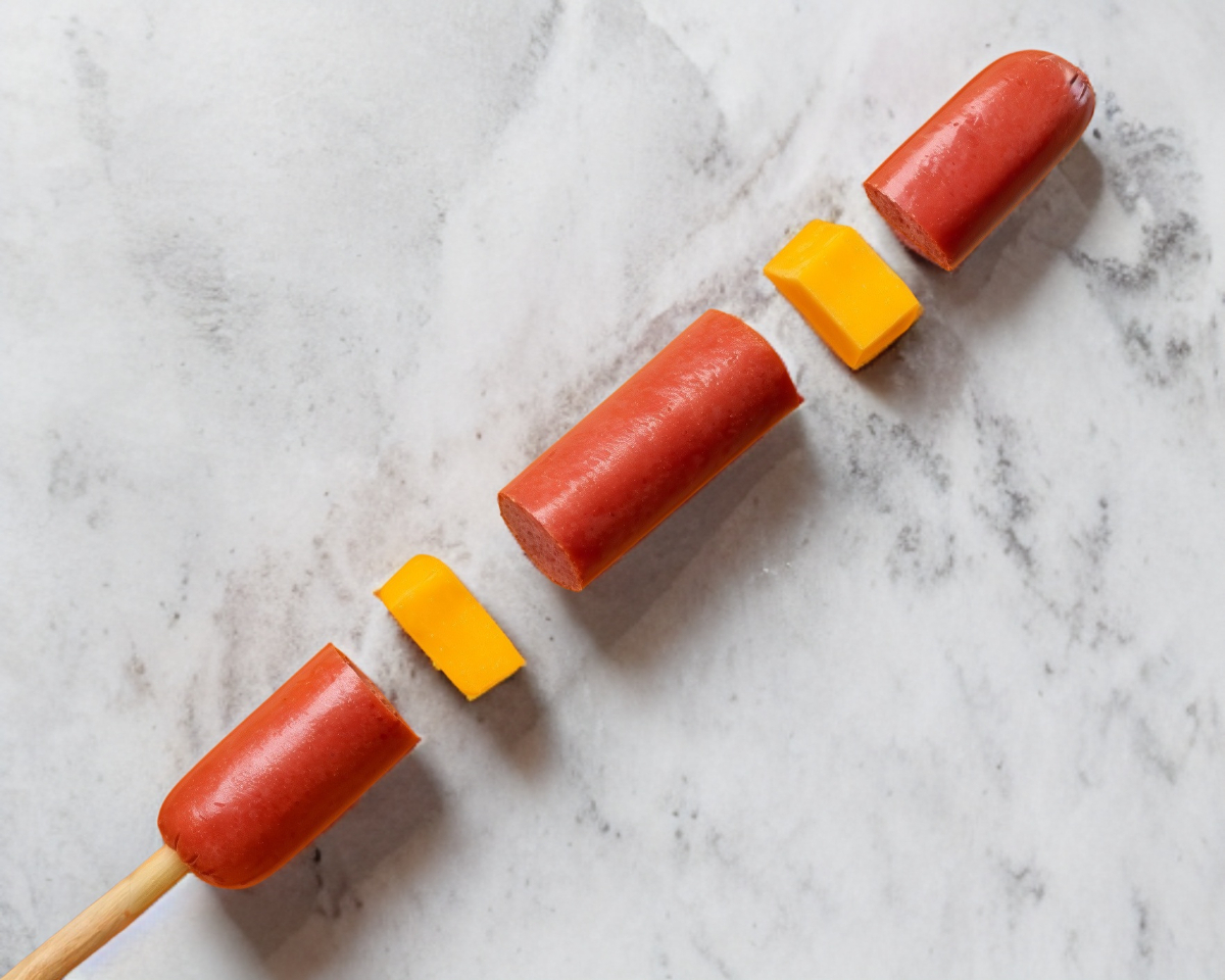 Crujiente banderilla de salchicha de pavo con cubitos de queso, preparada con masa Hangang y cubierta crujiente.