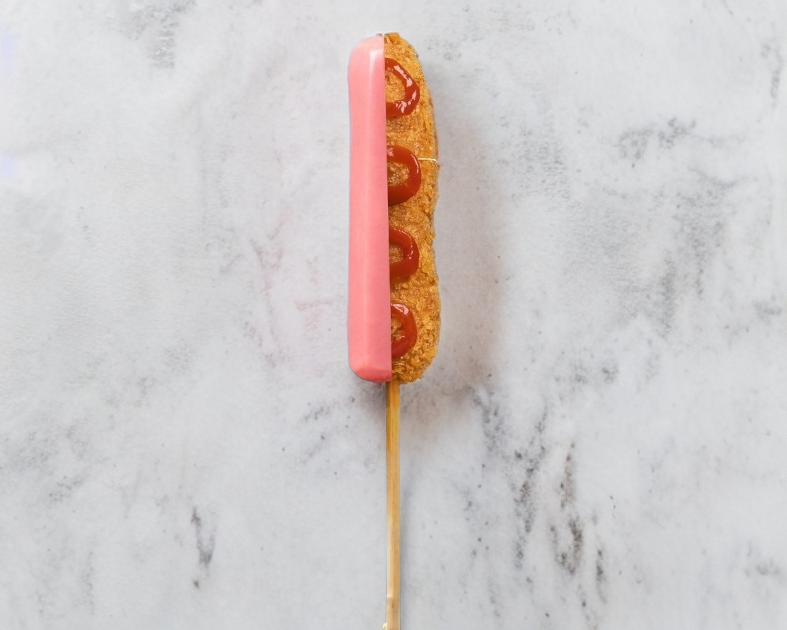 Crujiente banderilla de salchicha de res, preparada con masa Hangang y cubierta crujiente.