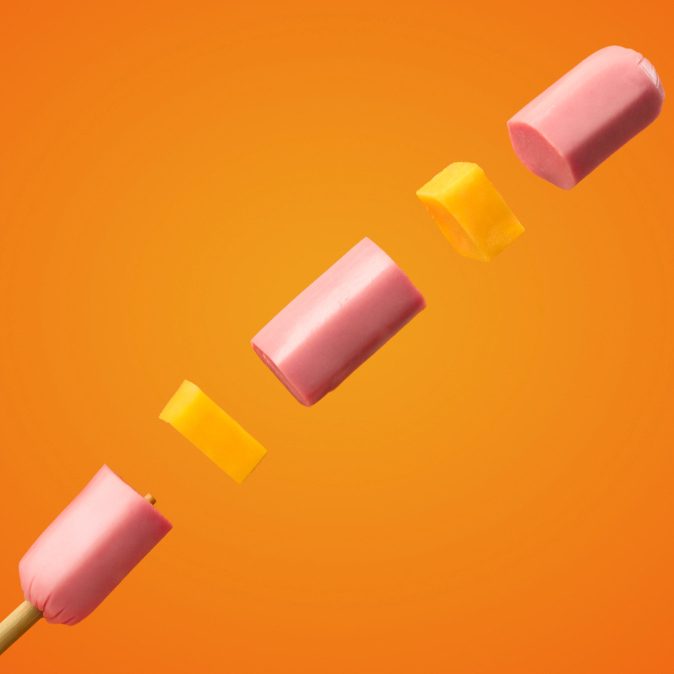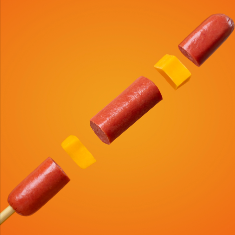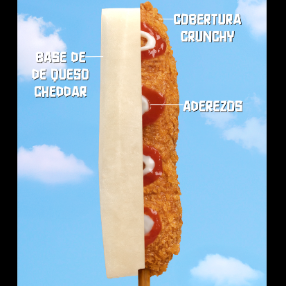 Crujiente banderilla de queso cheddar blanco y amarillo, preparada con masa Hangang y cubierta crujiente.