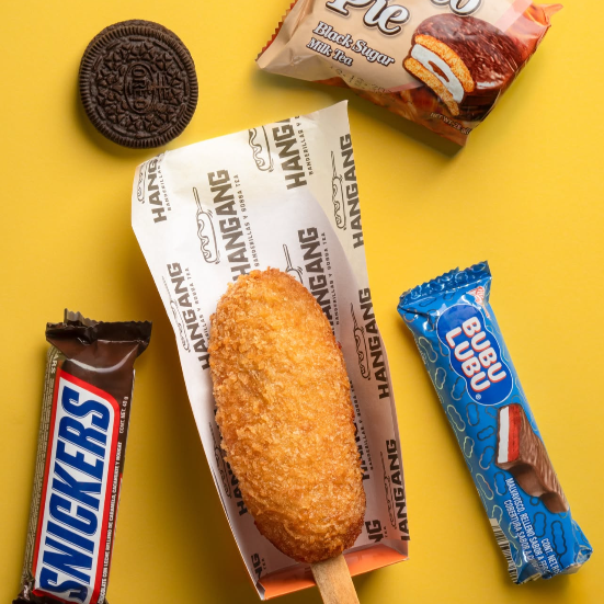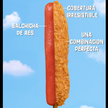 Crujiente banderilla de salchicha de res, preparada con masa Hangang y cubierta crujiente.