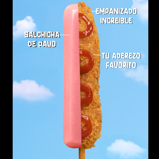 Crujiente banderilla de salchicha de pavo, preparada con masa Hangang y cubierta crujiente.