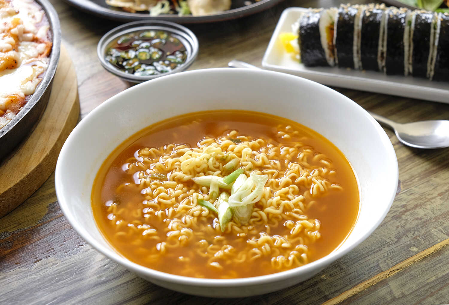 Fideos coreanos en caldo picante con huevo y verduras, un sabor reconfortante y auténtico.