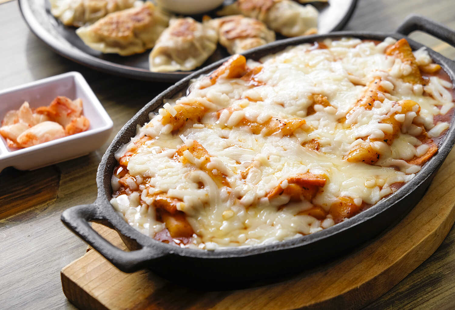 Tiras gruesas de arroz en salsa de pasta de chile picante (gochujang), lamina de pescado y queso mozzarella.