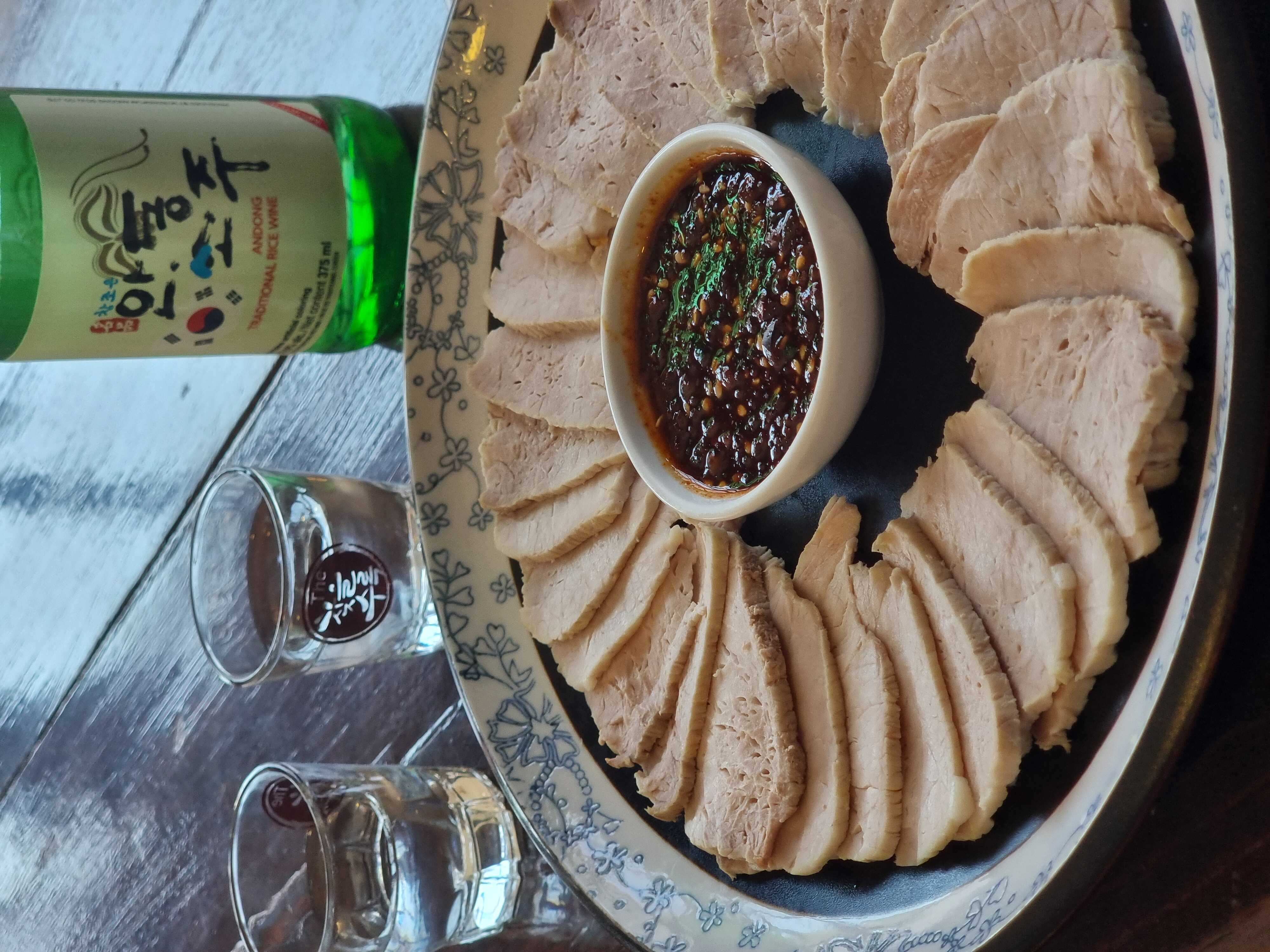 EI 'Suyuk' es una especialidad coreana que consiste en carne de cerdo hervida y cortada en finas lonchas. Se sirve con salsa especial.
