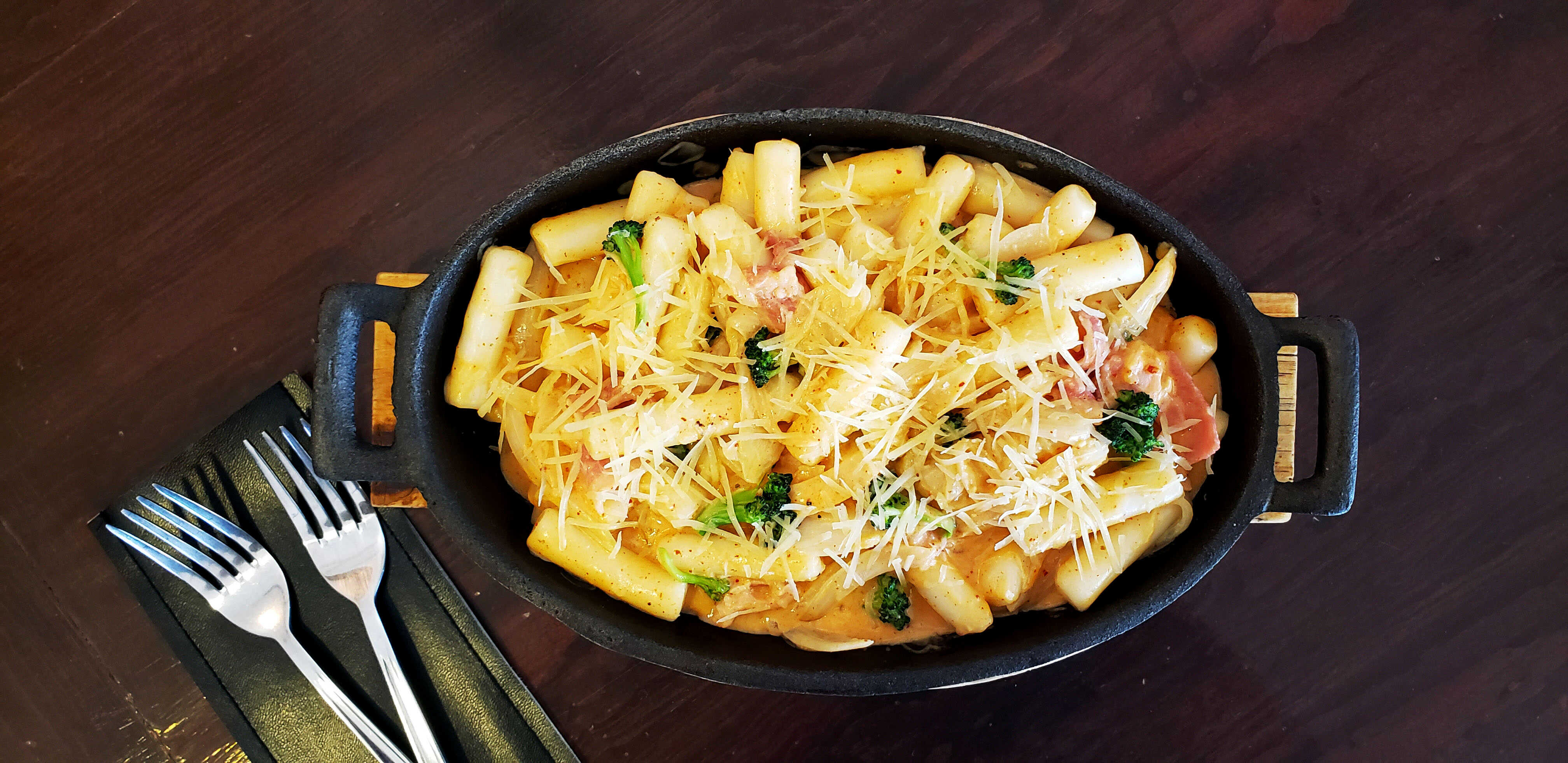 Tiras gruesas de arroz en salsa de crema con tocino, cebolla, brócoli y queso parmesano.