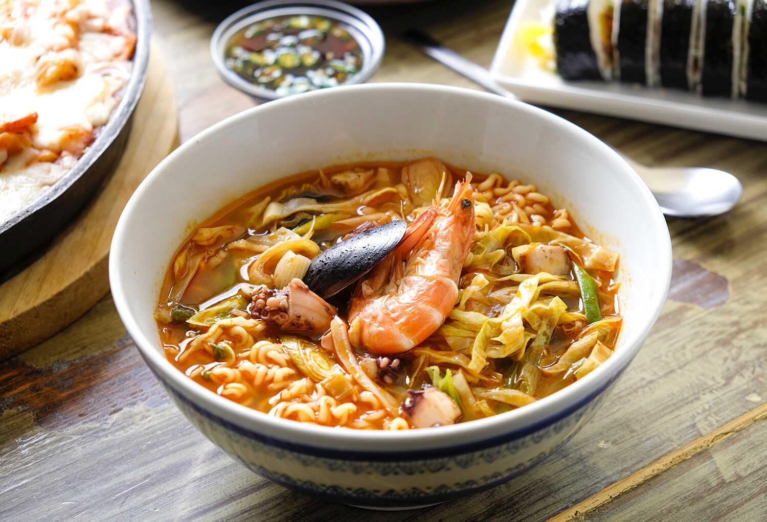 Fideos coreanos en caldo picante con mariscos frescos: camarones, calamar y mejillones.
