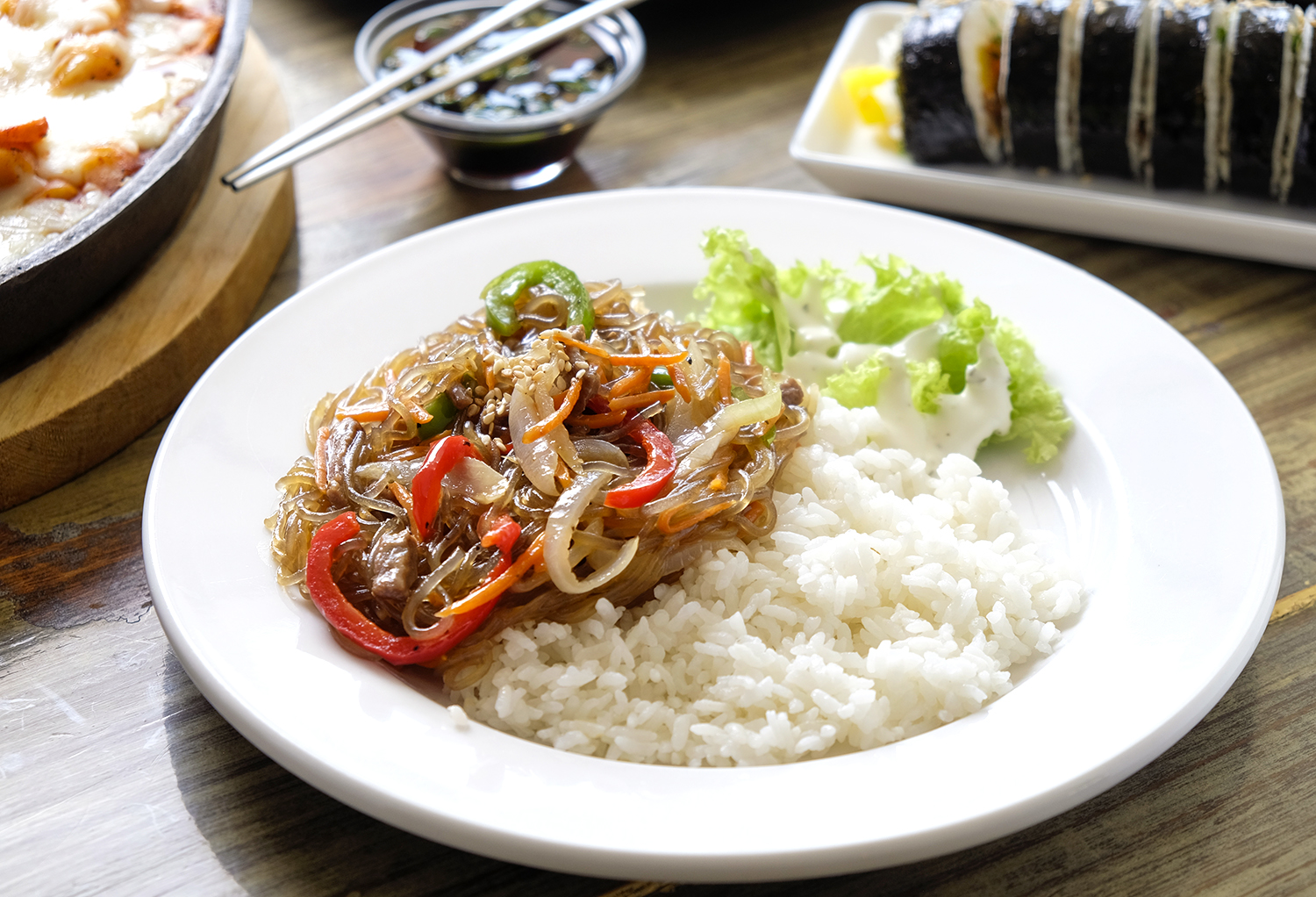 Arroz acompañado de fideos de camote salteados con verduras y salsa de soya, un clásico coreano lleno de sabor.