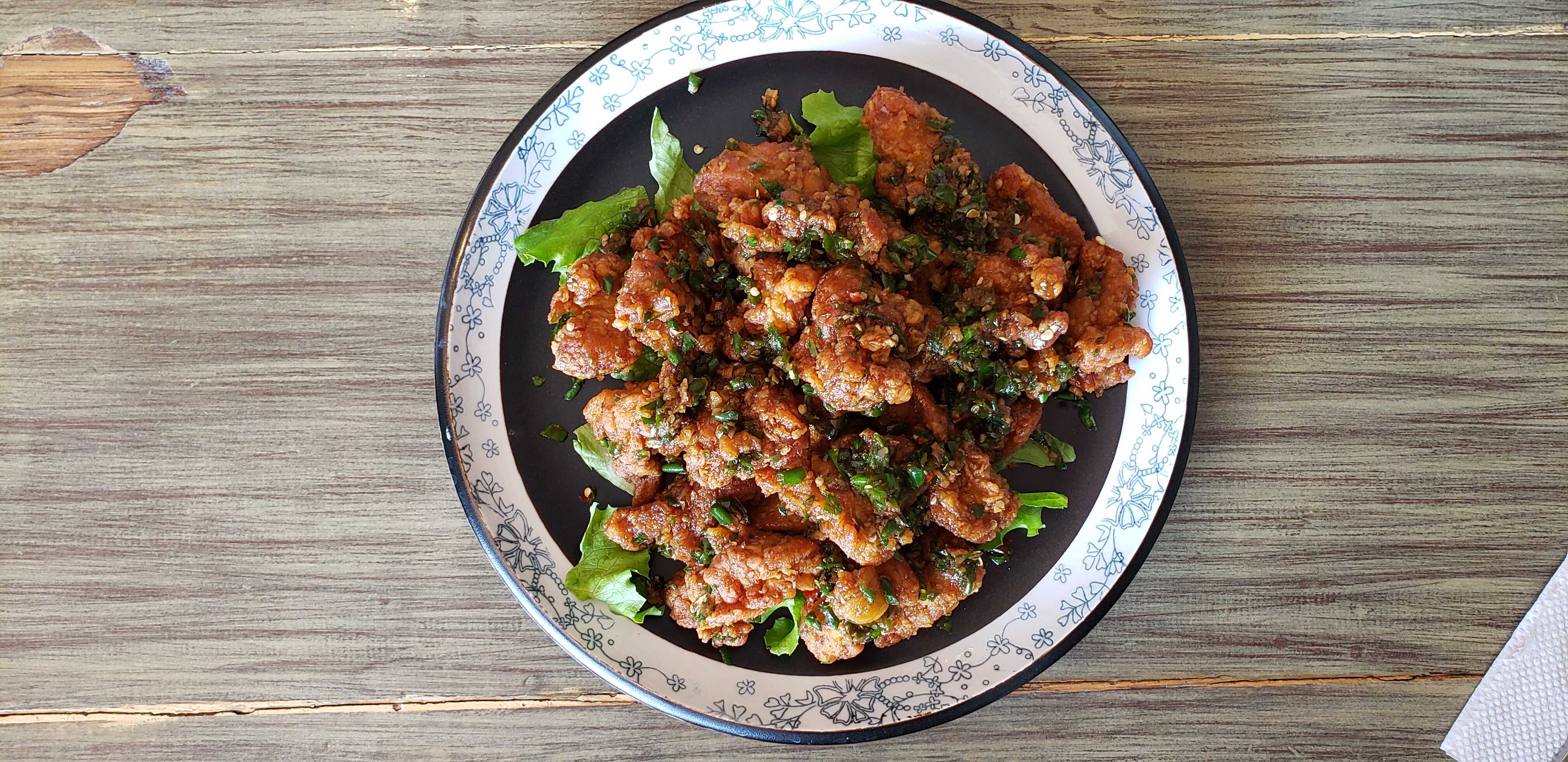 Pollo frito sin hueso con salsa a base de chile y ajo.