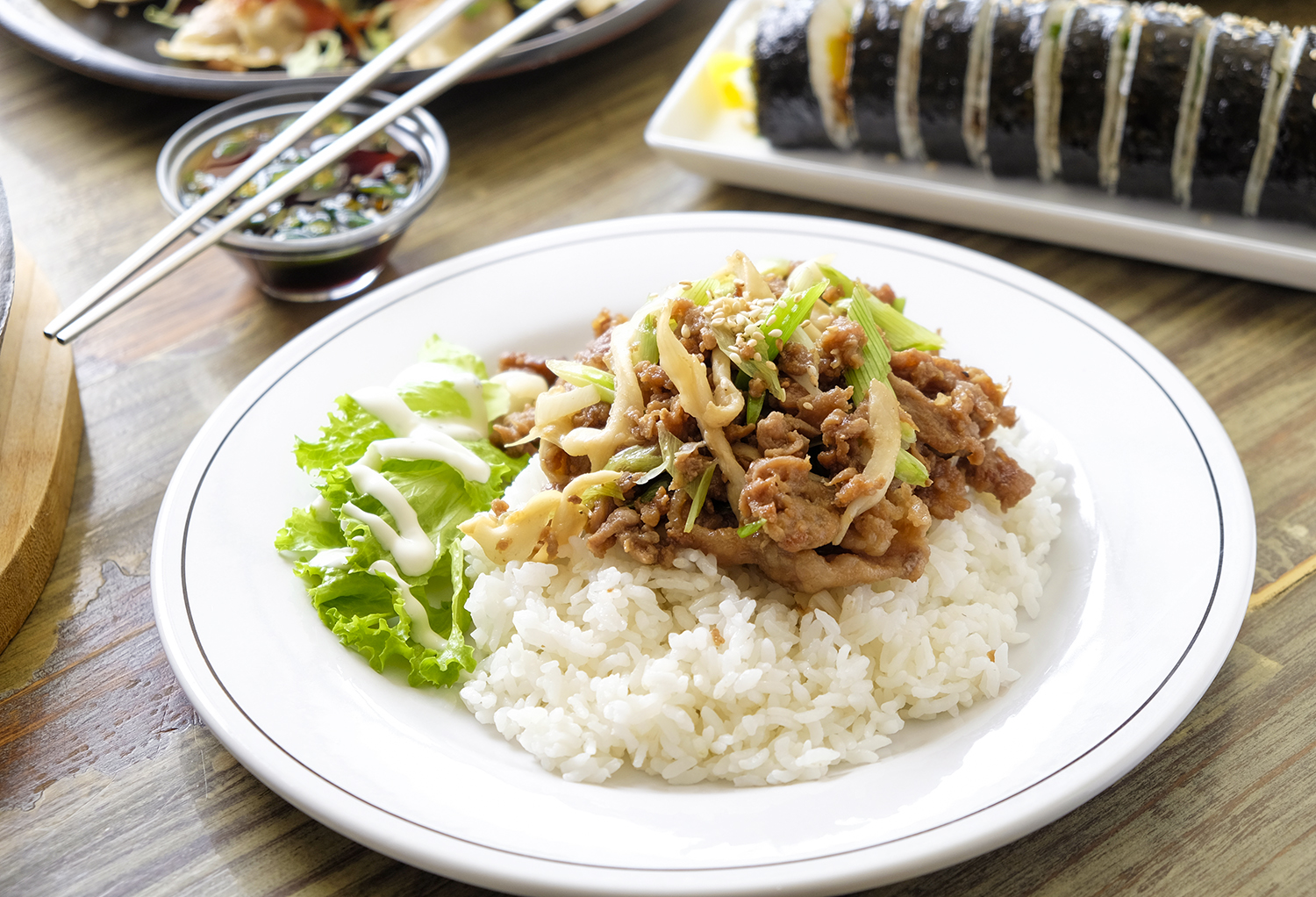 Roll coreano de arroz y algas relleno con bulgogi, carne marinada al estilo coreano y verduras frescas.