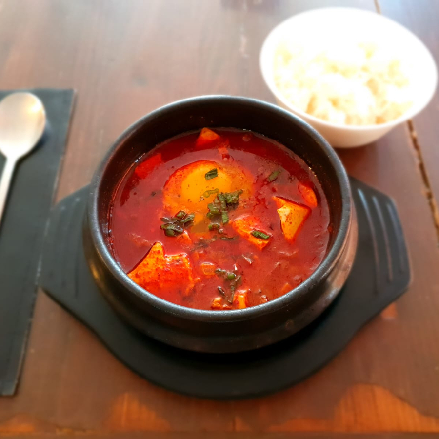 Estofado coreano con tofu suave, verduras frescas y caldo picante, servido caliente para disfrutar su esencia tradicional.