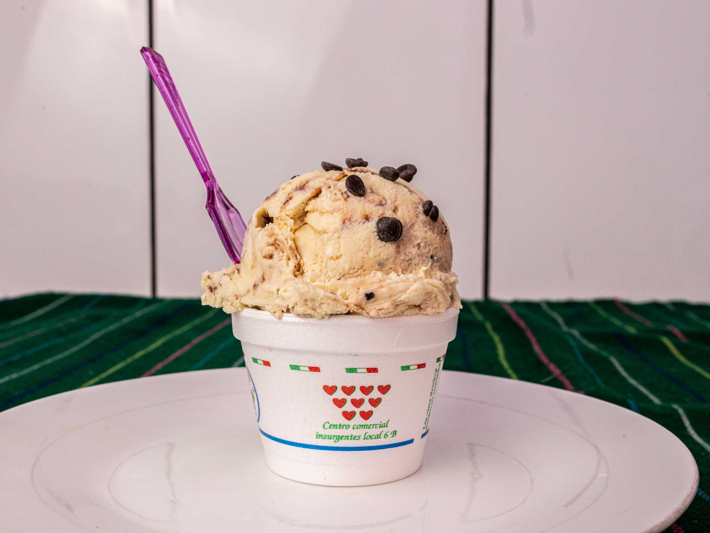 Combinación helado de vainilla con chispas de chocolate.