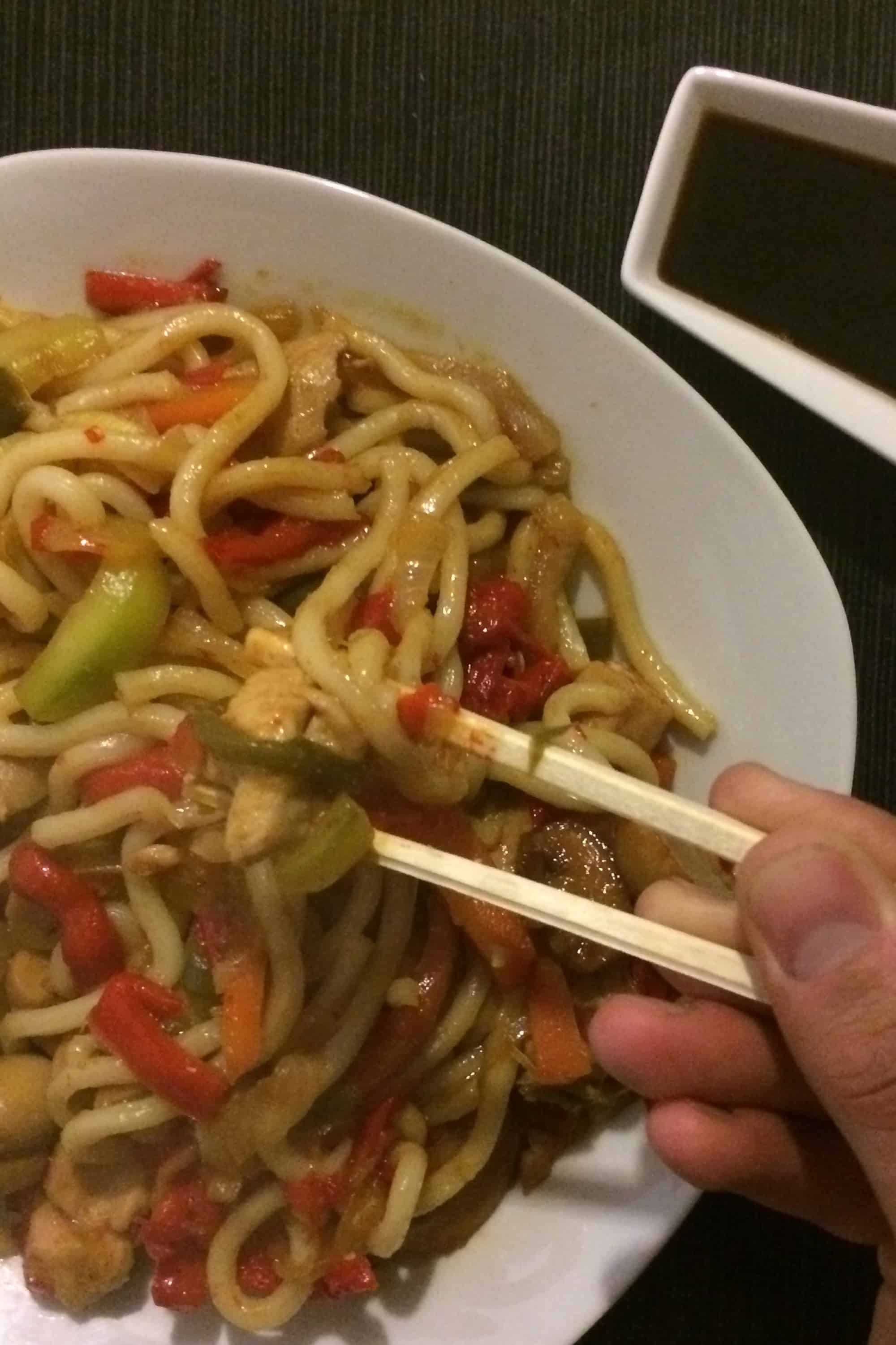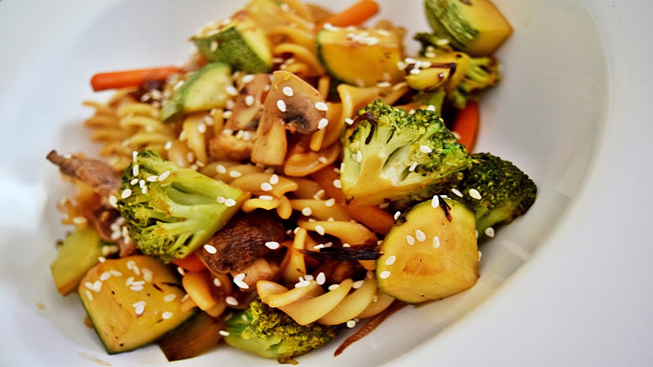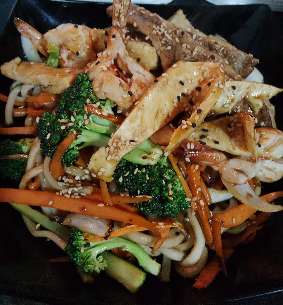 Tallarines a la plancha acompañado de verduras y salsa teriyaki