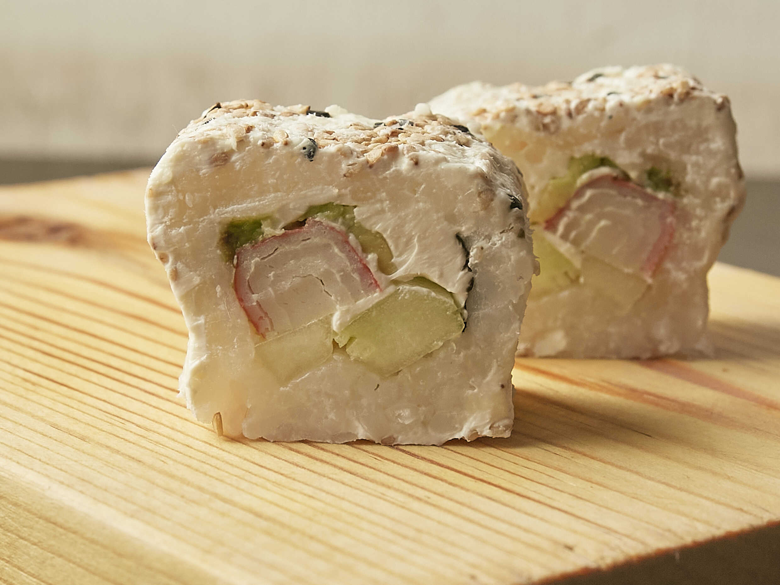 Massago, Queso, pepino, aguacate y salmon por fuera